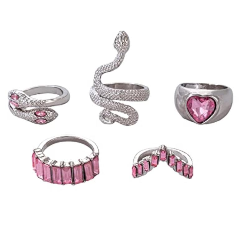 Elegant set of 5 stackable rings featuring silver plated snake-inspired design with pink stone studded heart. Perfect for everyday wear or special occasions.