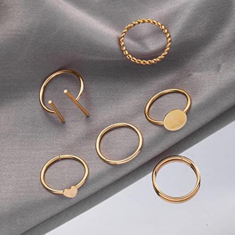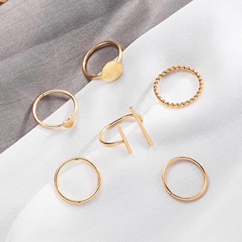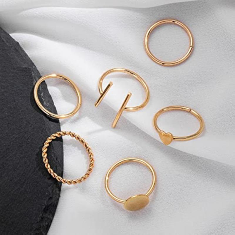 Add a touch of contemporary style to your look with this set of 6 stackable rings. Mix and match them for a unique and trendy look.
