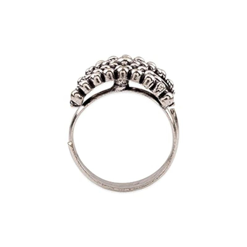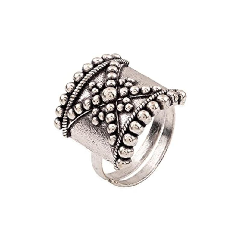 Add a touch of elegance to your outfit with this stylish Rava Ball Oxidized Plated Ring. Perfect for any occasion, this ring is a must-have in your accessory collection.