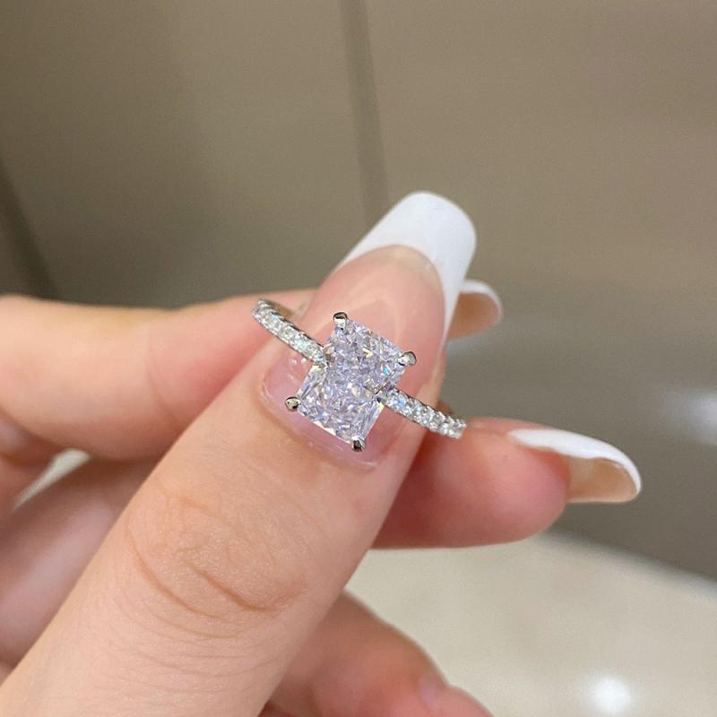 Add elegance to your special day with this stunning rectangular zirconia wedding ring. Elevate your bridal look with this silvery band featuring a shimmering geometric square stone.