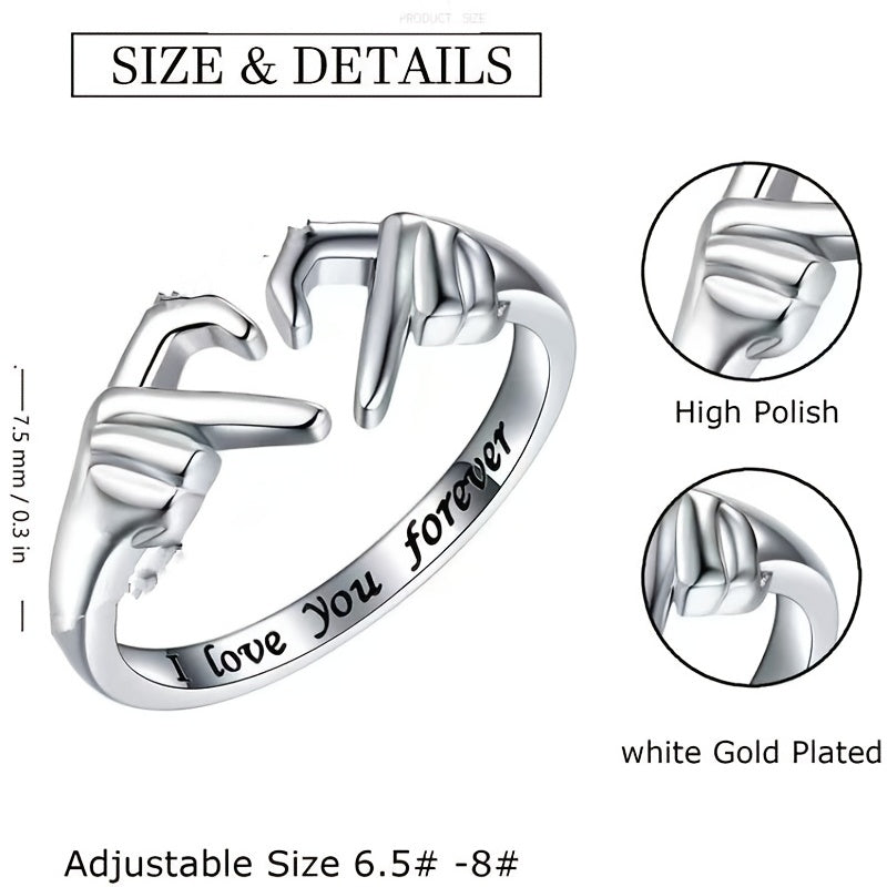 Express your love with this beautiful heart to heart ring featuring two hands intertwined in a loving gesture. This romantic European and American design is perfect for couples.