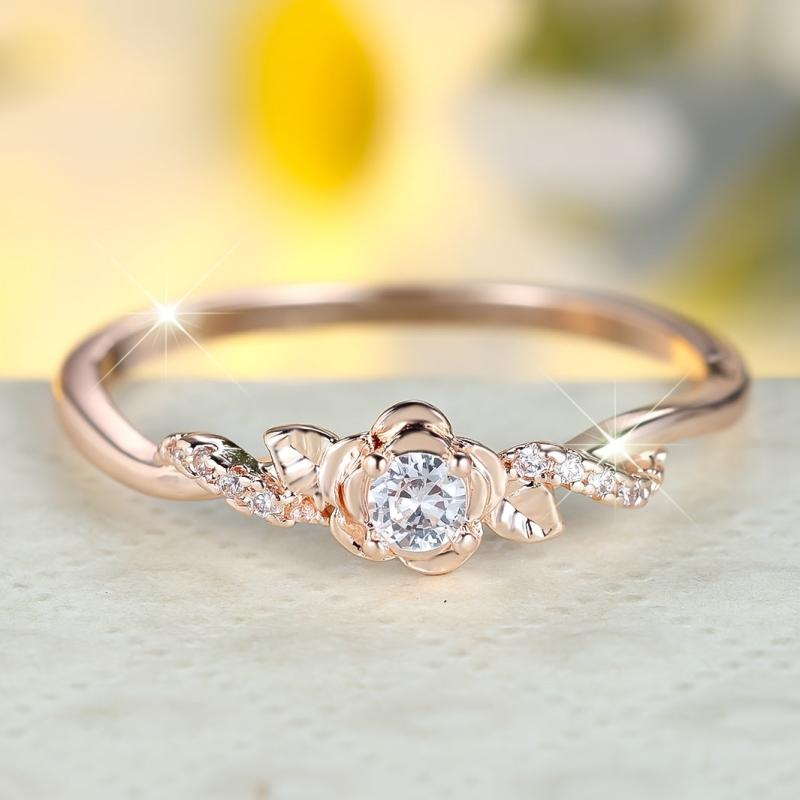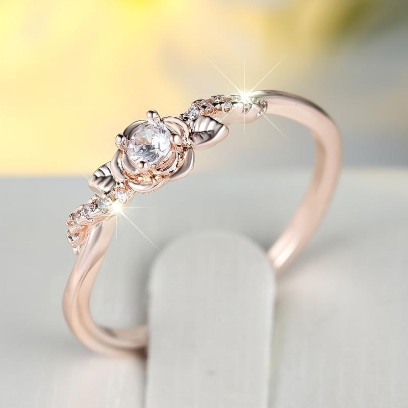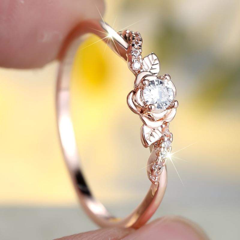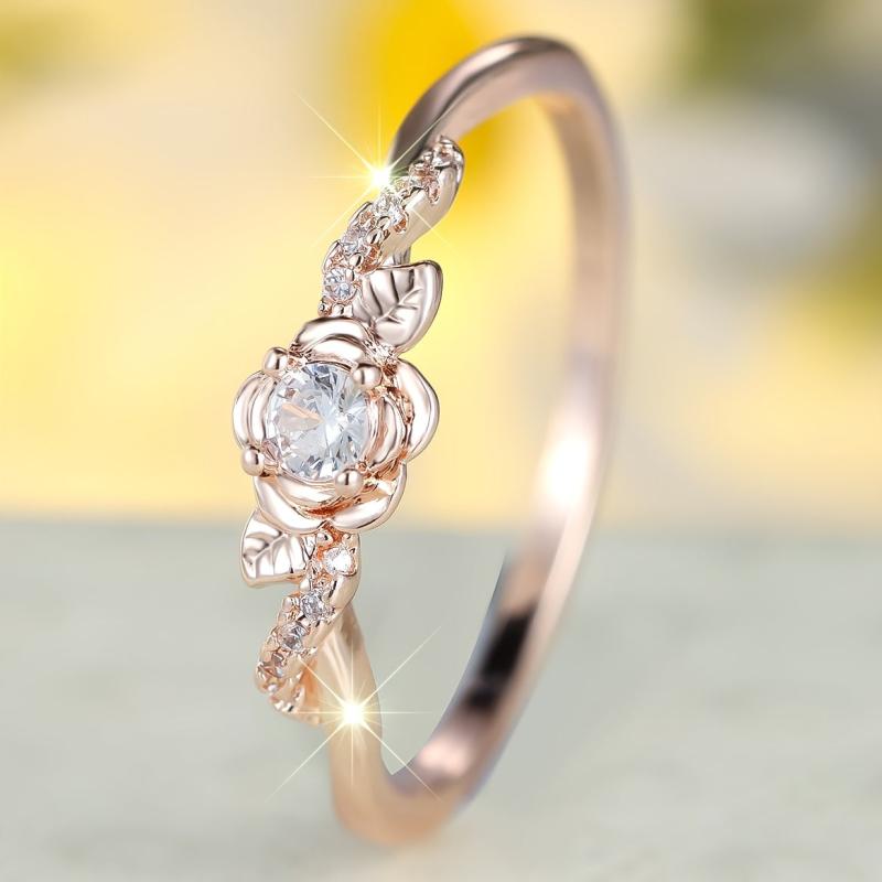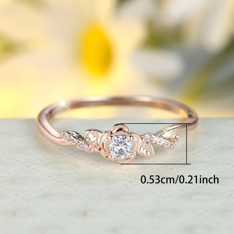 This beautiful rose flower ring features a romantic design with cubic synthetic zirconia gemstones set in a golden tone band. Perfect for weddings, banquets, and special occasions.