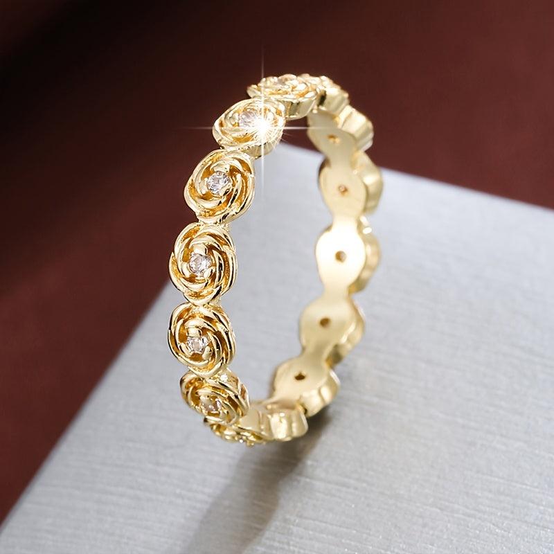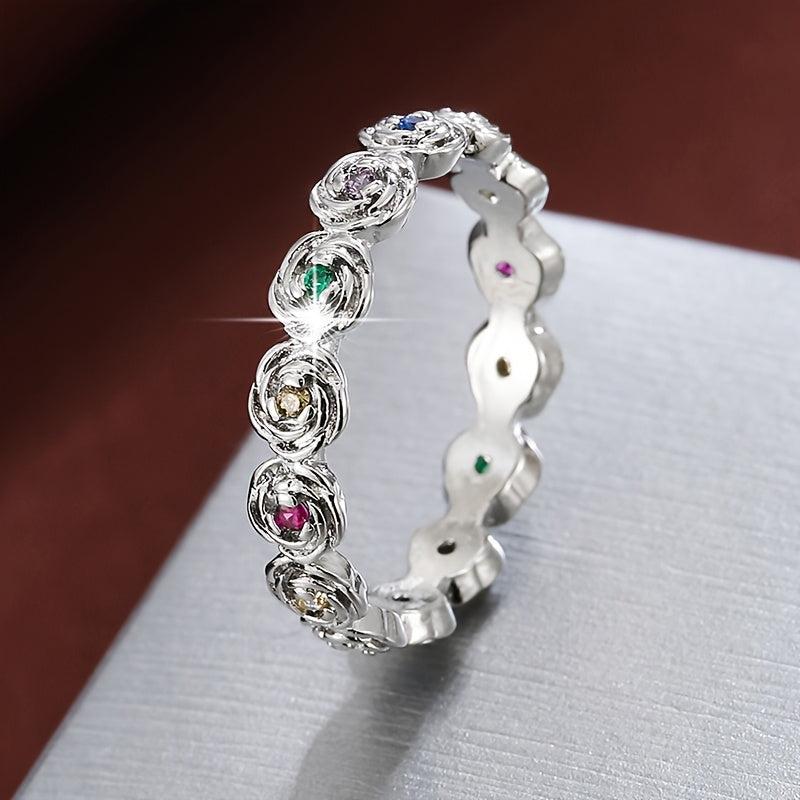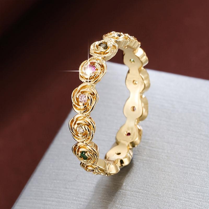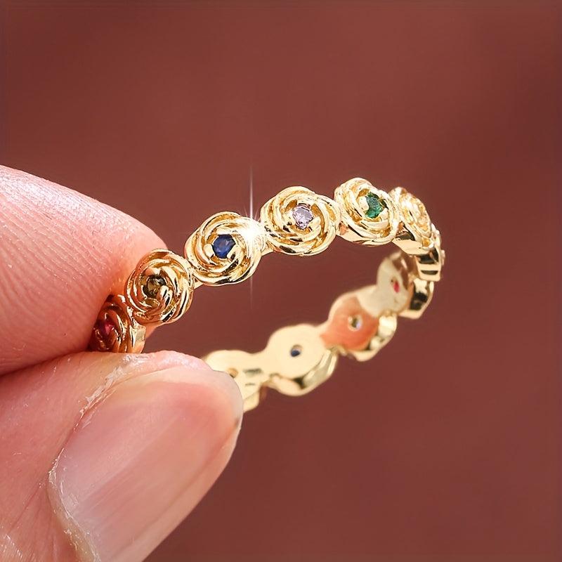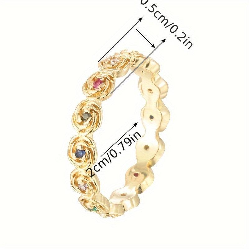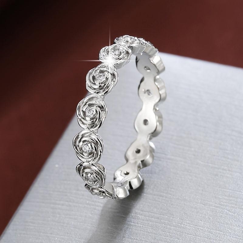 This exquisite women's ring features a delicate rose design inlaid with synthetic zirconia for a touch of elegance.