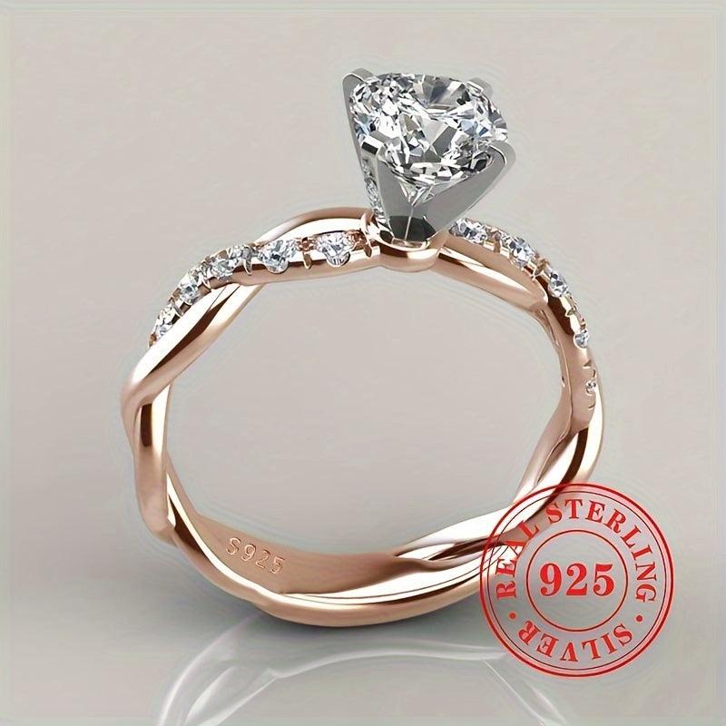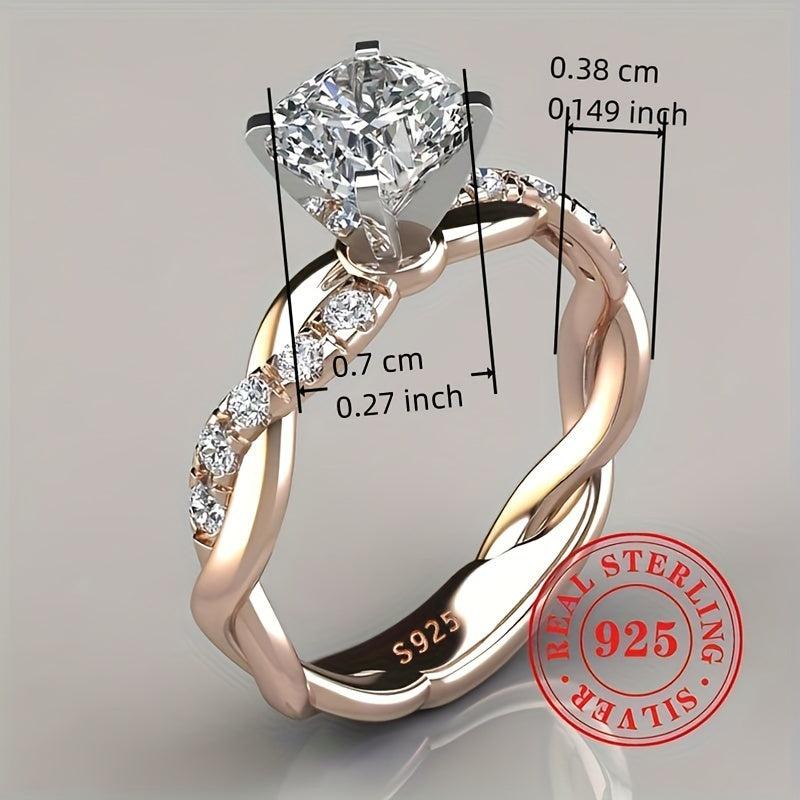 This stunning S925 silver wedding ring features a twist pattern design and double 4-prong inlay with synthetic zirconia, making it a perfect choice for engagement or proposal.
