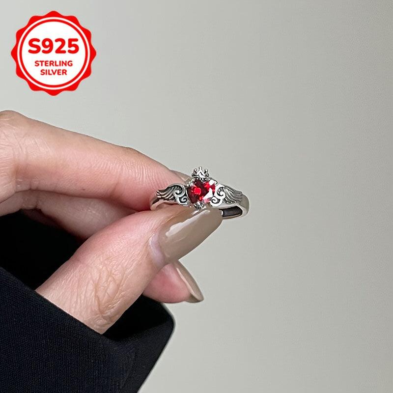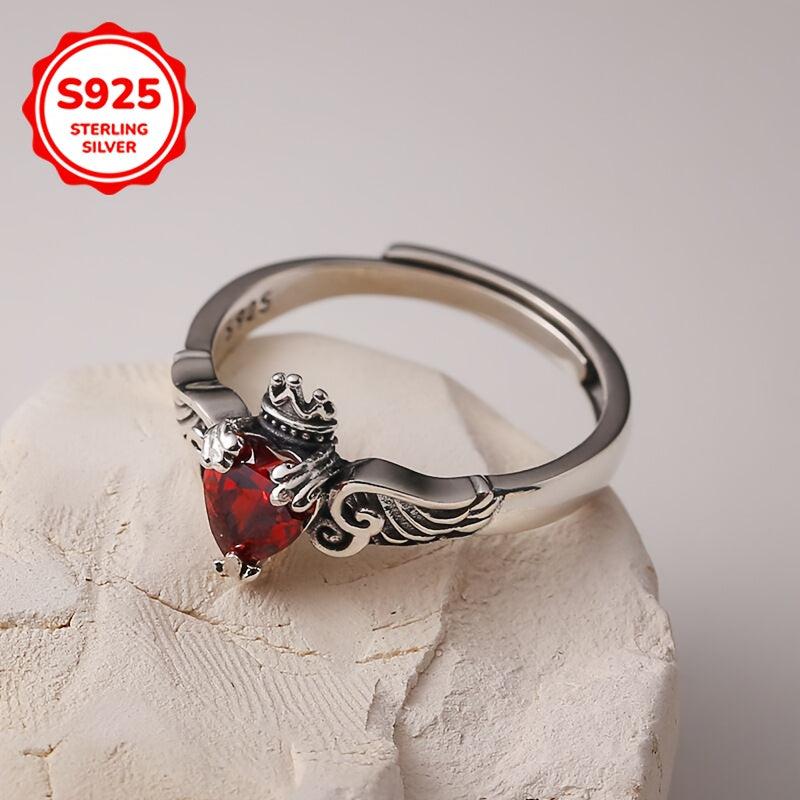S925 Low Allergy French Crown Wings Heart Ring Retro Style