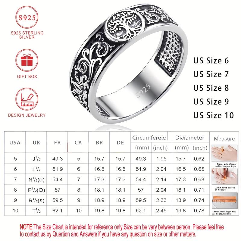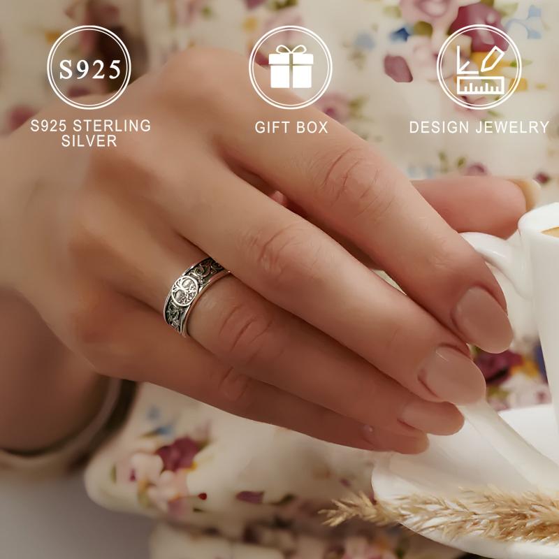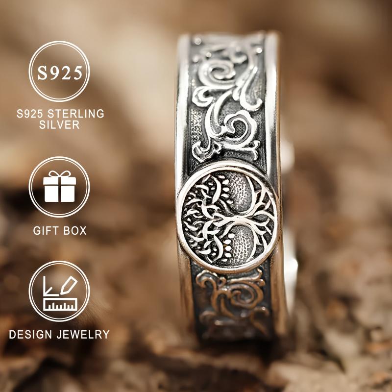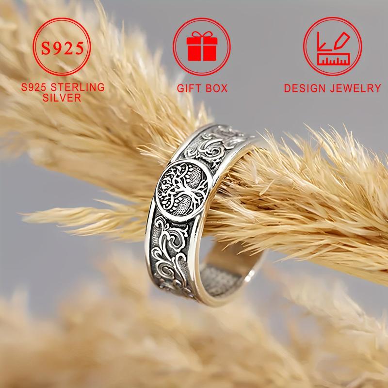 This S925 pure silvery ring features a tree of life design with retro flower carvings, making it a classic and elegant jewelry piece for daily wear.