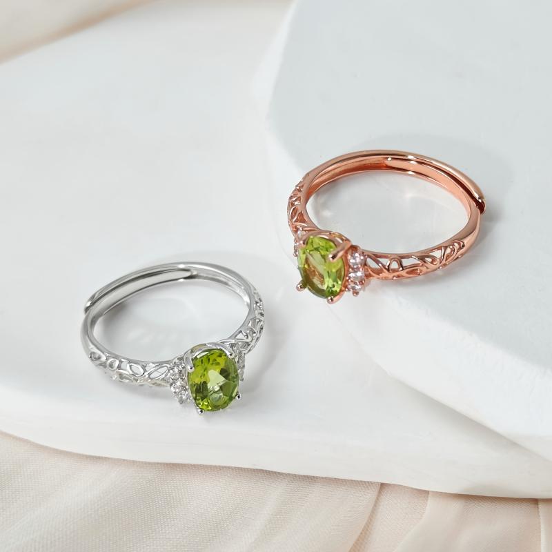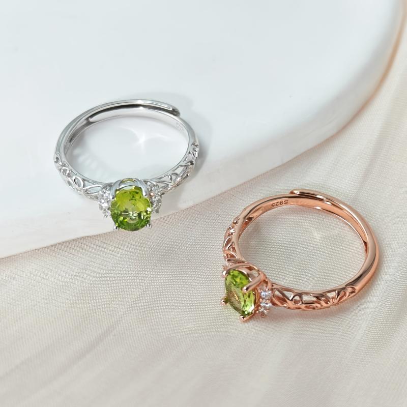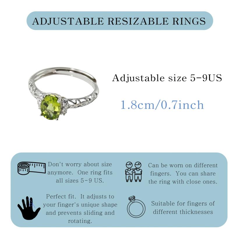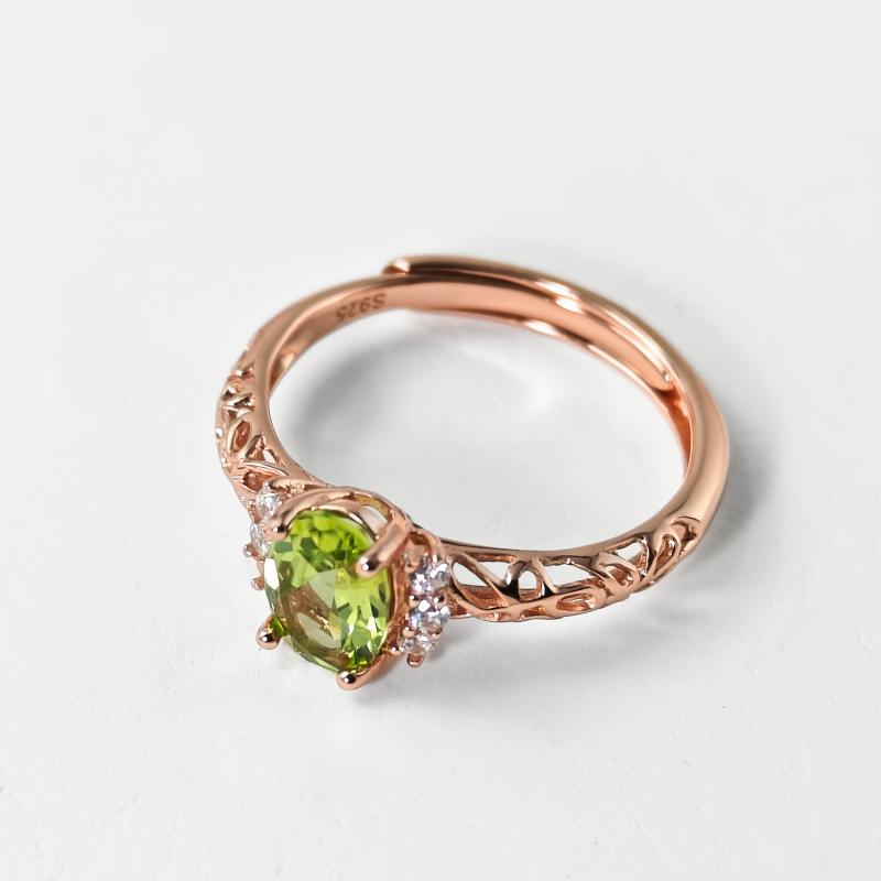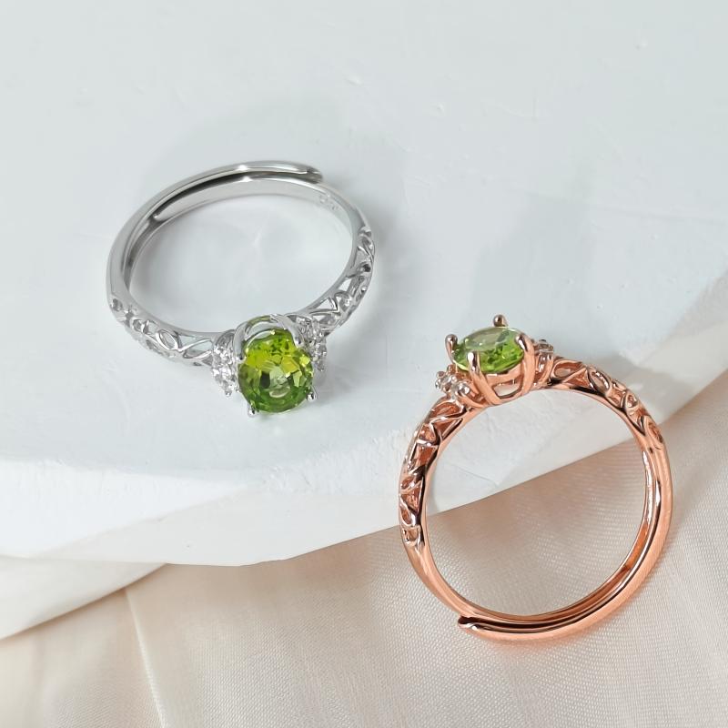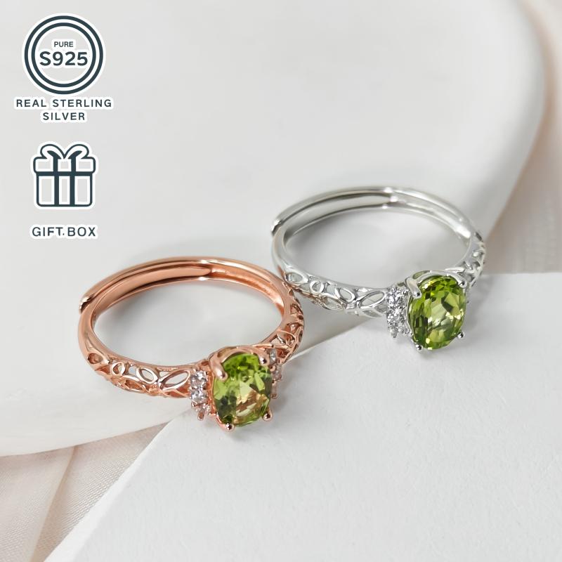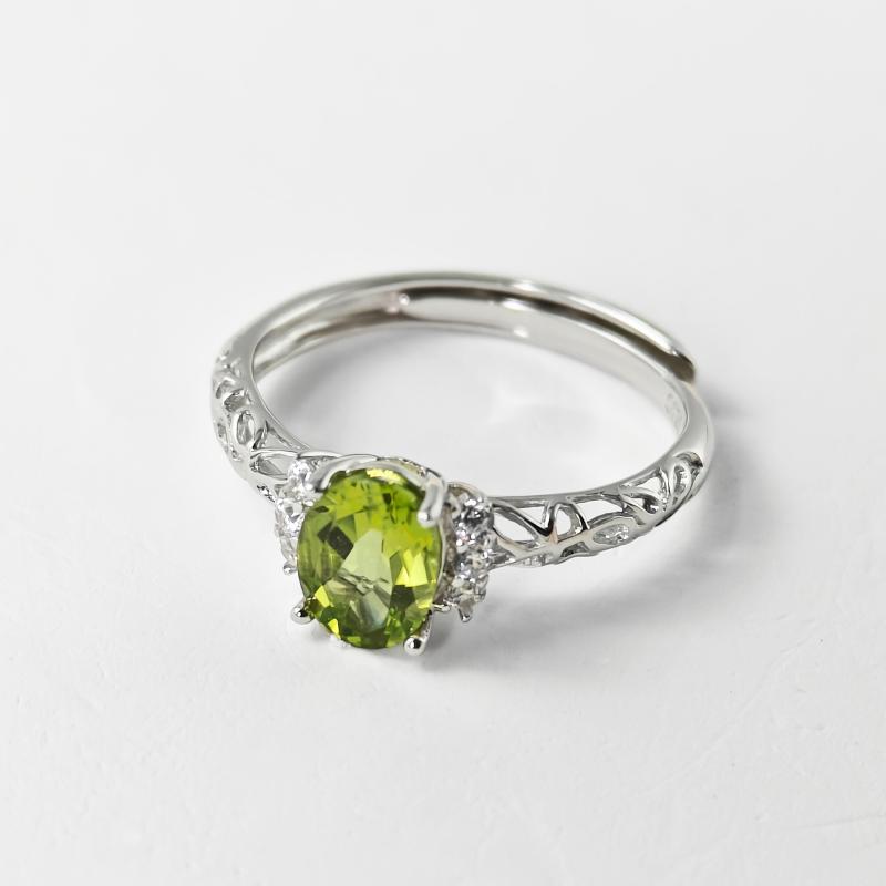 Beautiful S925 silver ring set featuring a stunning peridot stone and a unique hollow pattern design. This ring is approximately 1.68g in weight and is adjustable to fit different sizes. Perfect for gifting to family and friends.