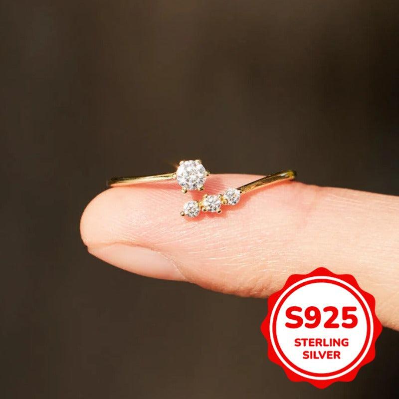 This elegant ring is made of sterling silver and features synthetic zirconia inlays. It is adjustable to fit any finger size, perfect for daily wear or casual occasions.