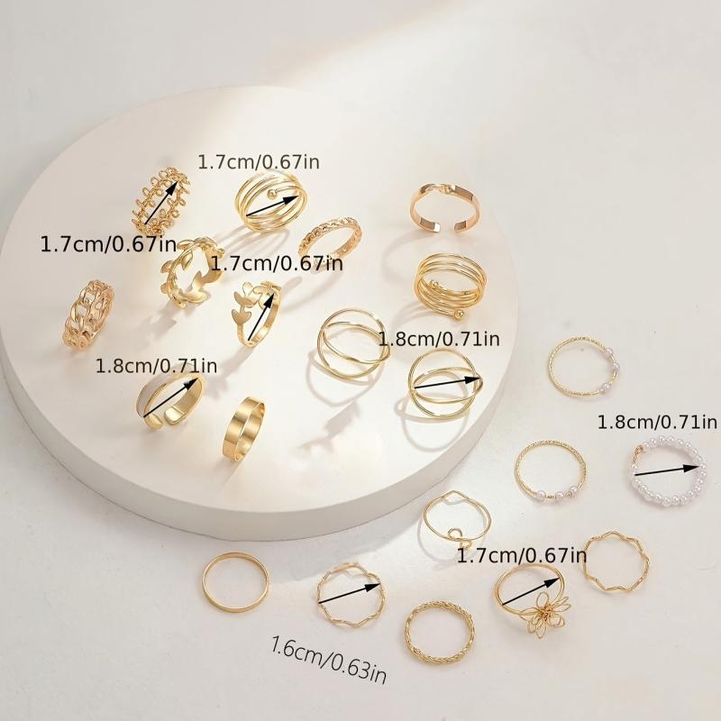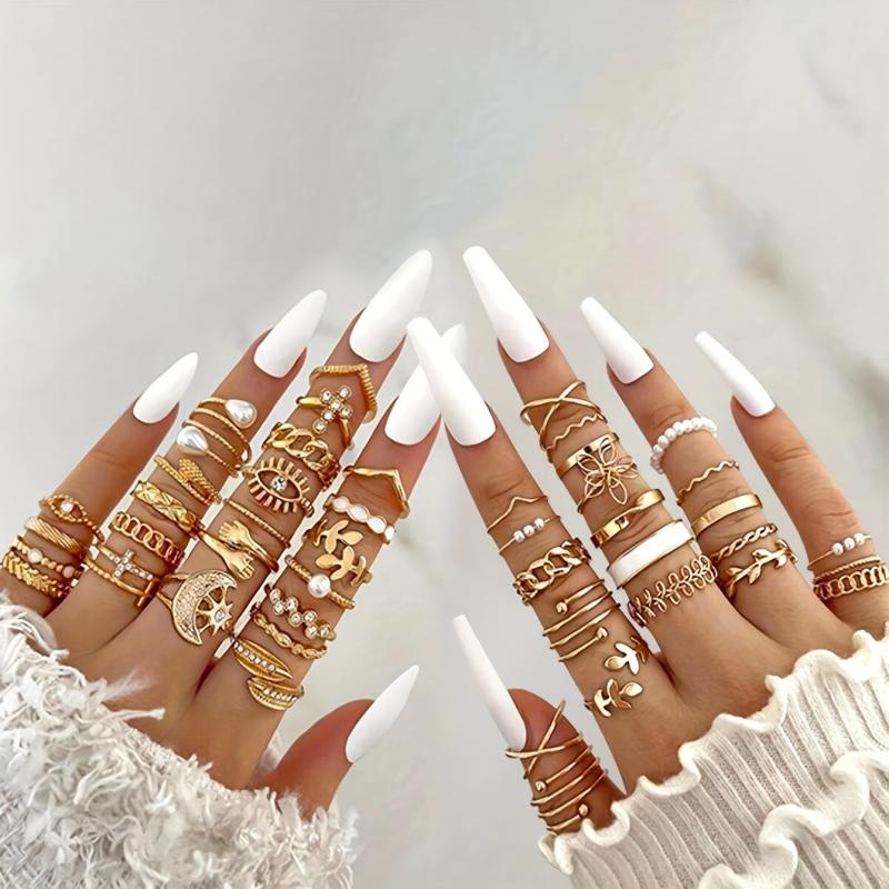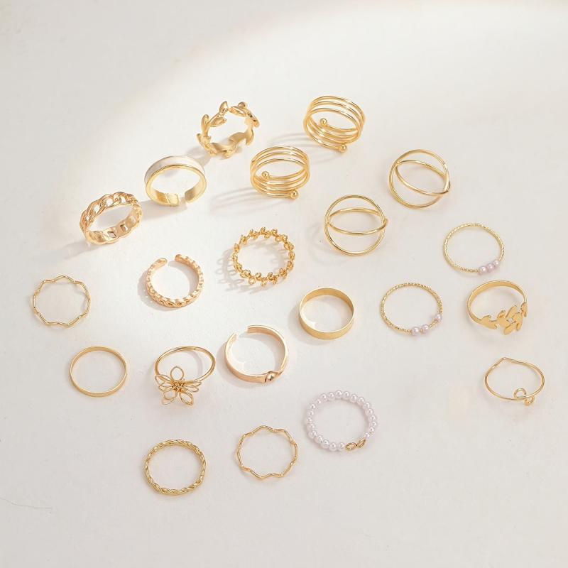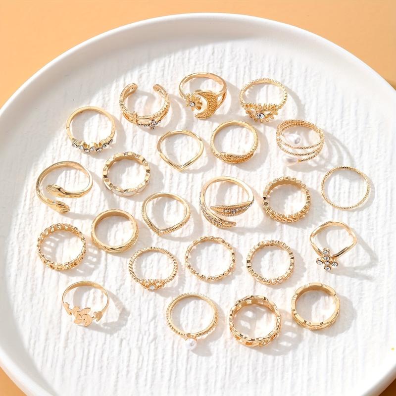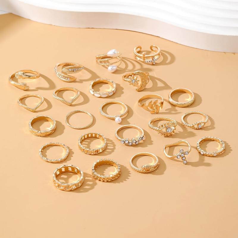 Elevate your vacation look with this set of 21 stylish and minimalist rings. Each ring features unique elements such as crosses, suns, moons, eyes, and leaves, adding a touch of elegance to your outfit.