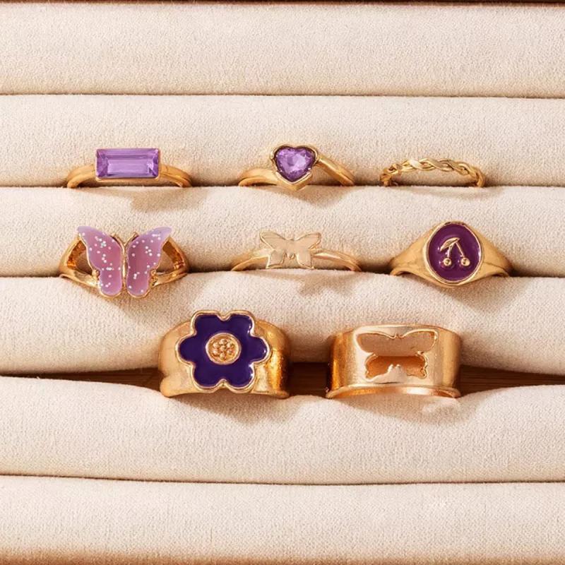 This set includes 8 beautiful plated rings with purple butterfly-floral design. Add a touch of elegance and charm to your outfits.