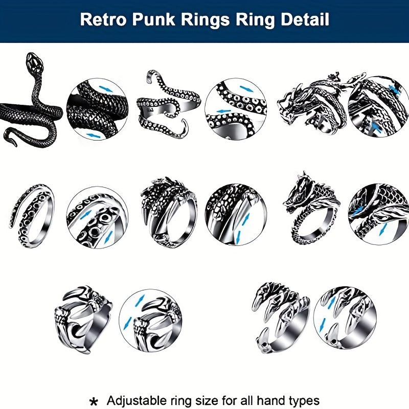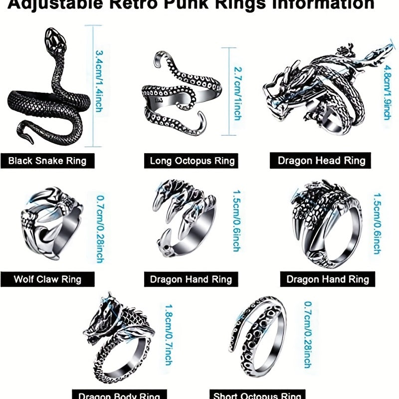 Add a touch of vintage style to your look with this set of 8 animal-themed rings. Each ring features a unique design inspired by dragons and snakes, and is adjustable to fit any finger size.