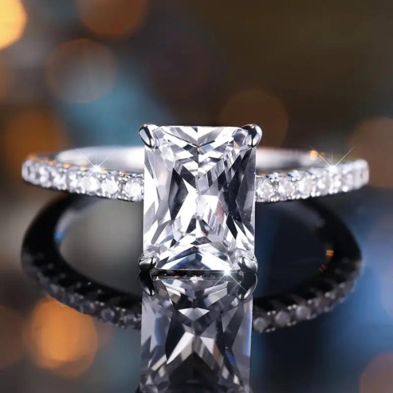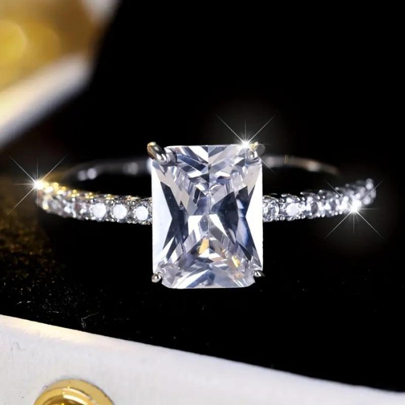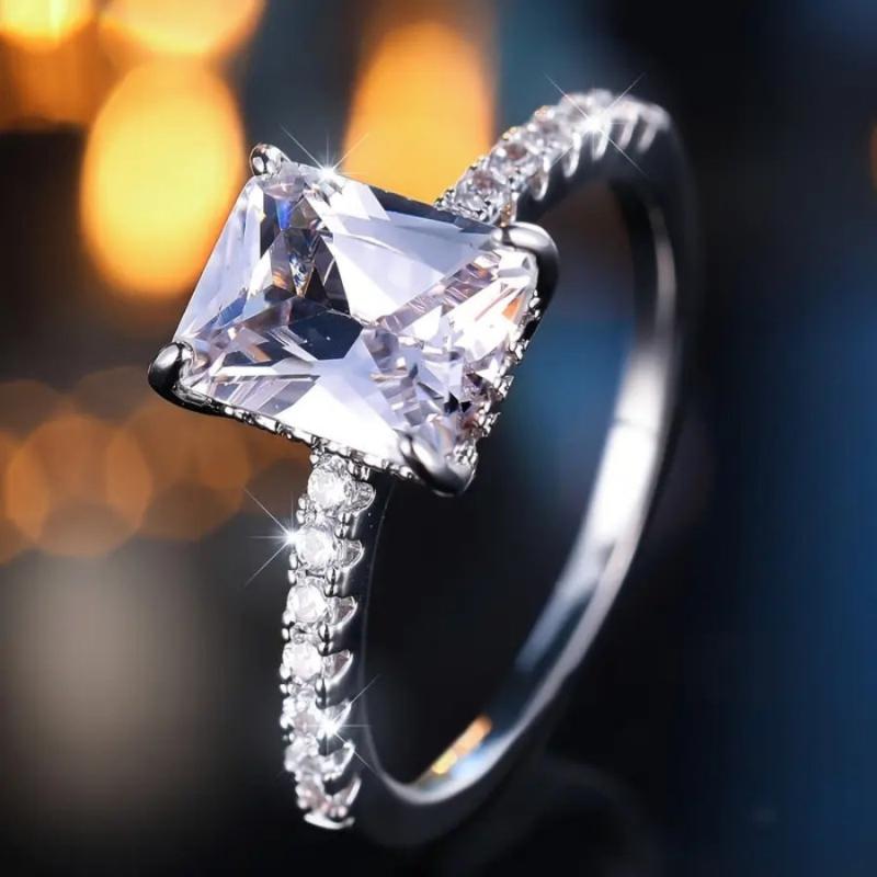 Elegant silver plated engagement ring featuring a princess cut synthetic zirconia stone in a four-prong setting. Perfect for weddings, parties, or as a Valentine's gift. Made of copper with a December birthstone.