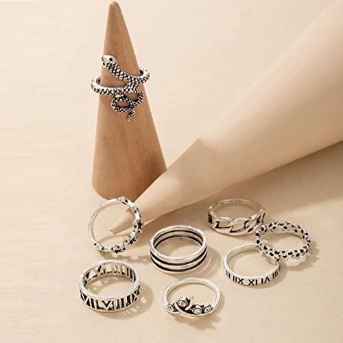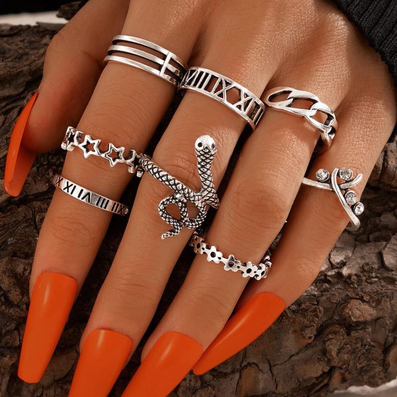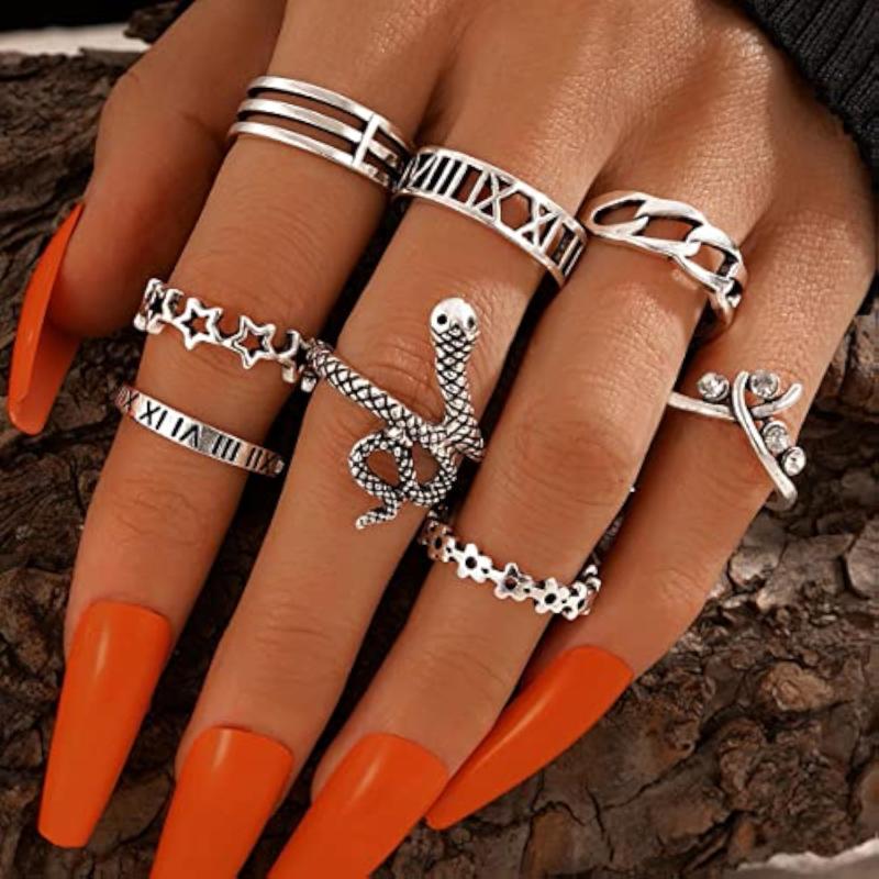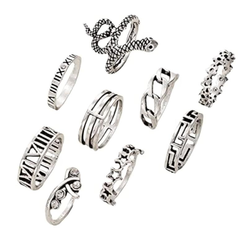 Elevate your style with this set of 9 snake-inspired stackable rings. Perfect for mixing and matching, these rings add a touch of elegance to any outfit.