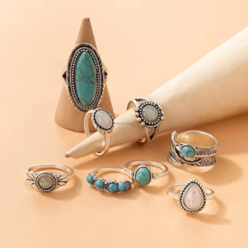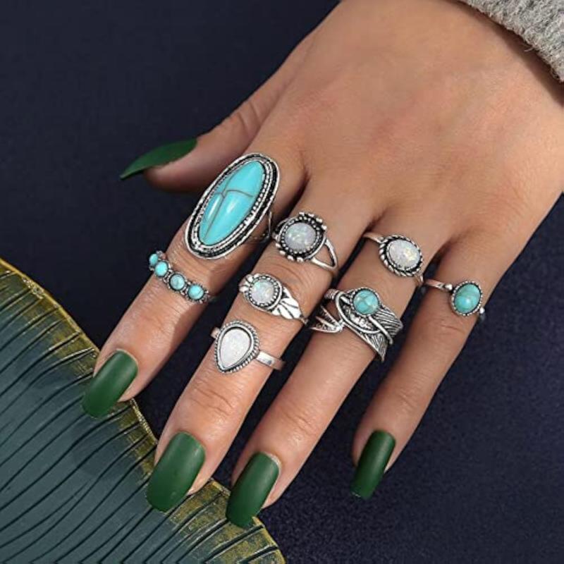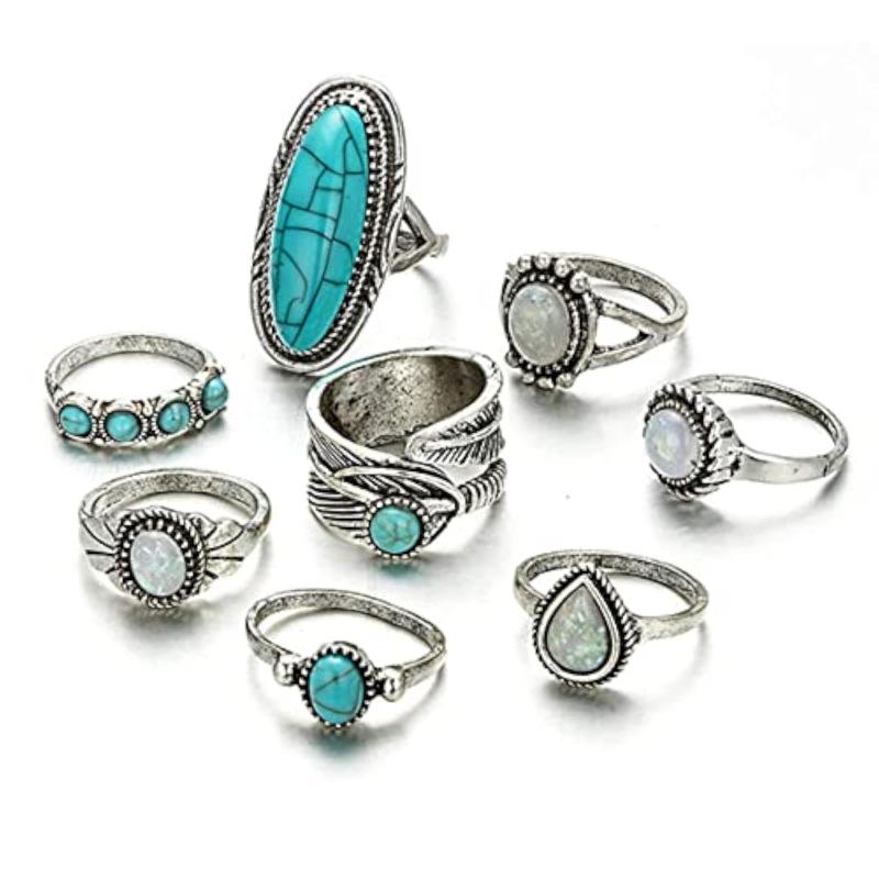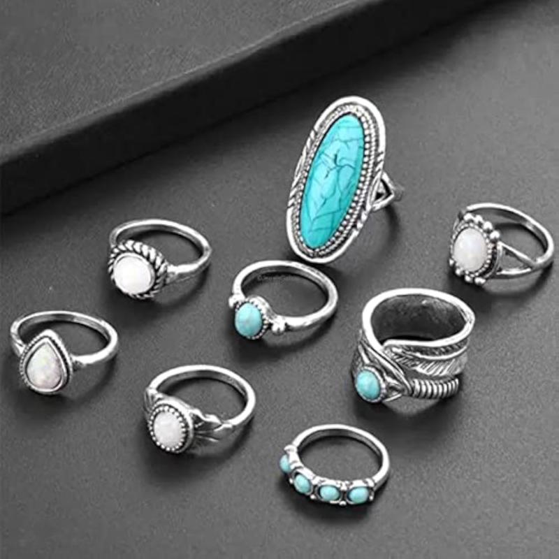 Elevate your style with this set of 8 contemporary finger rings featuring turquoise stones. Crafted in silver plated metal, these rings are perfect for any occasion.
