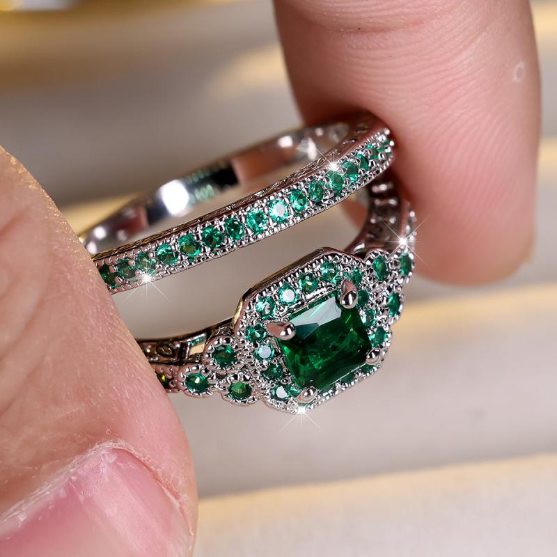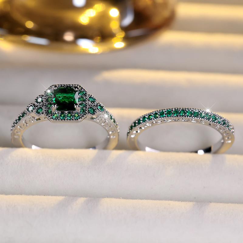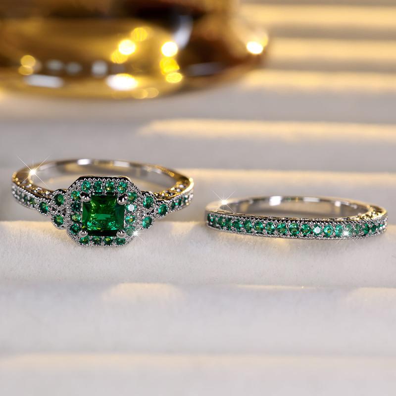 This stunning 2-piece set features a princess-cut silvery green stone on an engagement ring and a matching wedding band. Perfect for couples looking for unique and elegant wedding jewelry.