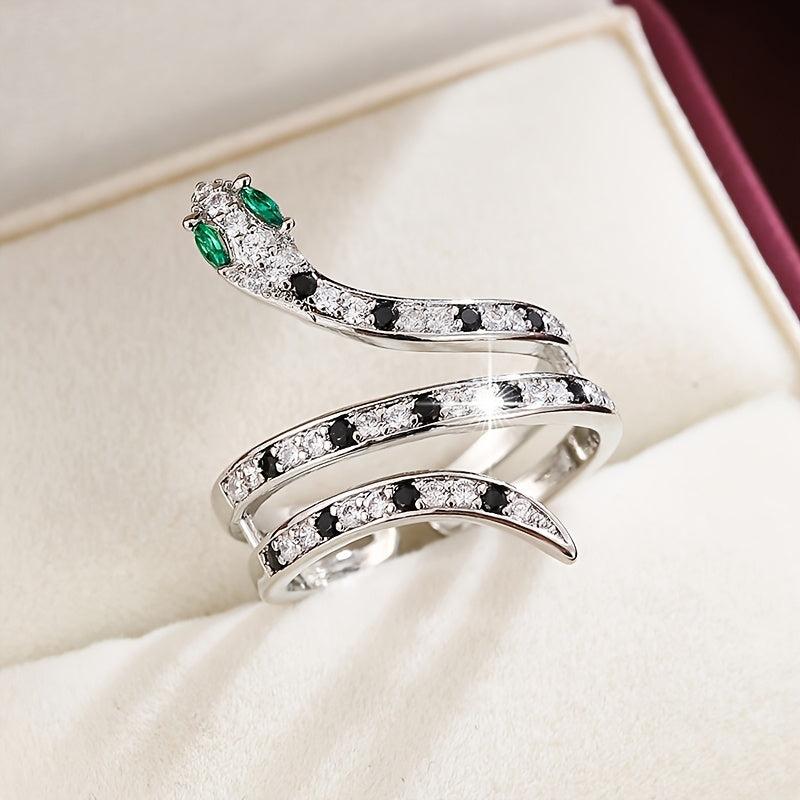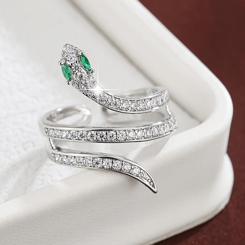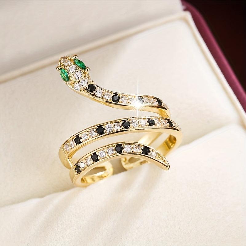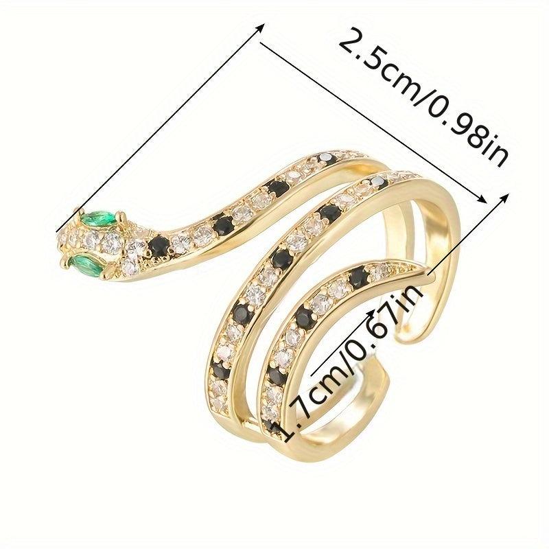 Add a touch of elegance to your casual attire or special occasions with this stunning snake women's ring. Featuring a vibrant green gemstone and clear synthetic zirconia stones, all set in a golden plated band, this jewelry piece is perfect for gifting to her.