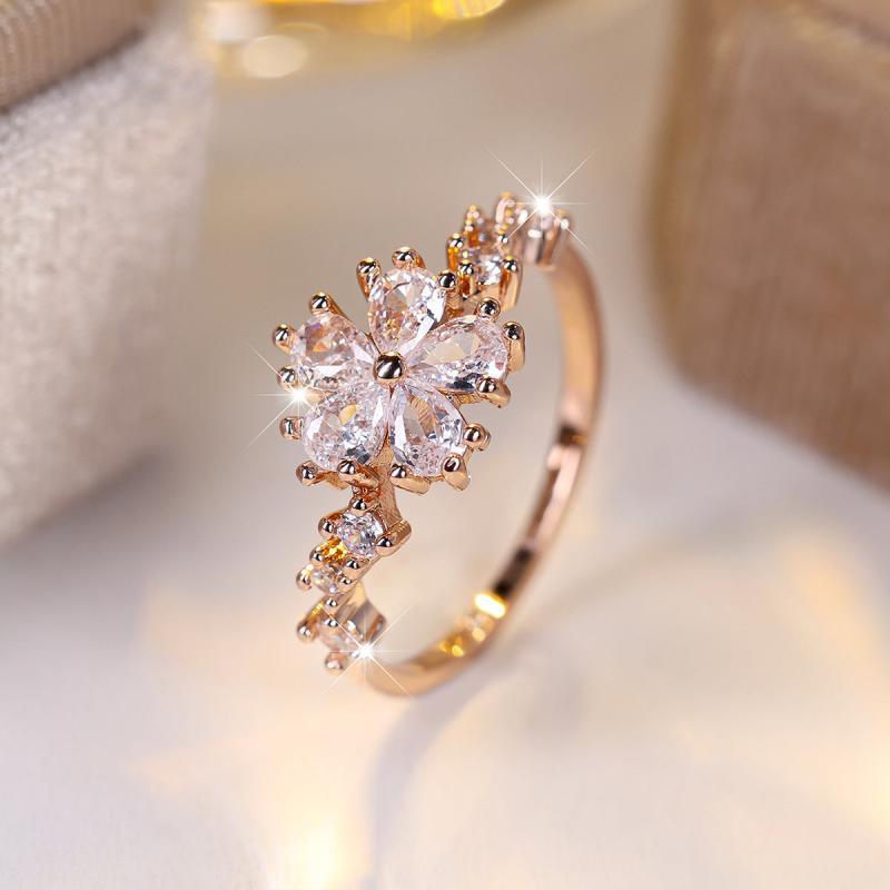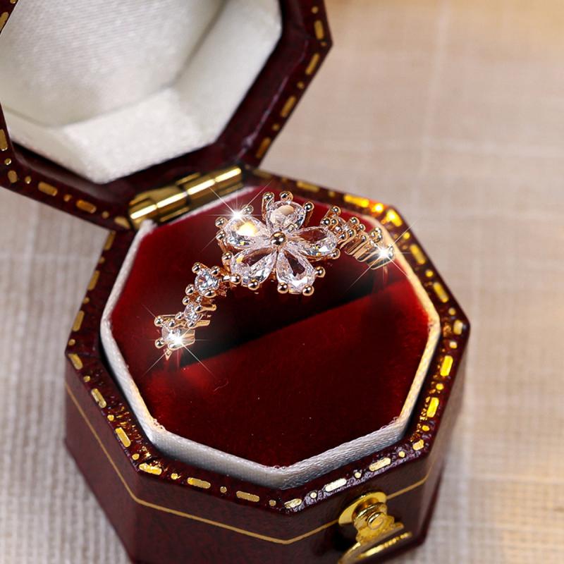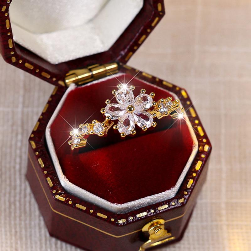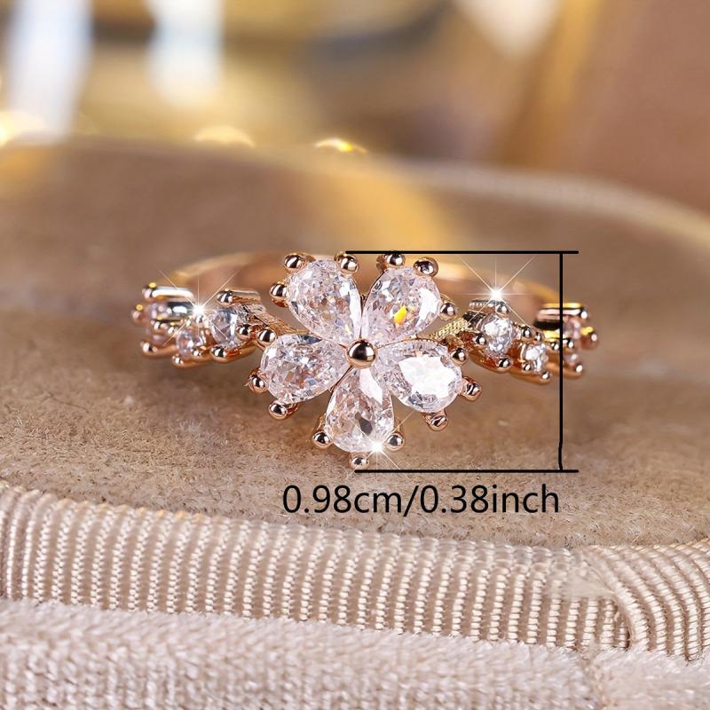 Elegant and eye-catching engagement ring featuring sparkling zirconia stones in a flower design. Choose from golden or rose golden for a stunning piece that will make a statement on your special day.