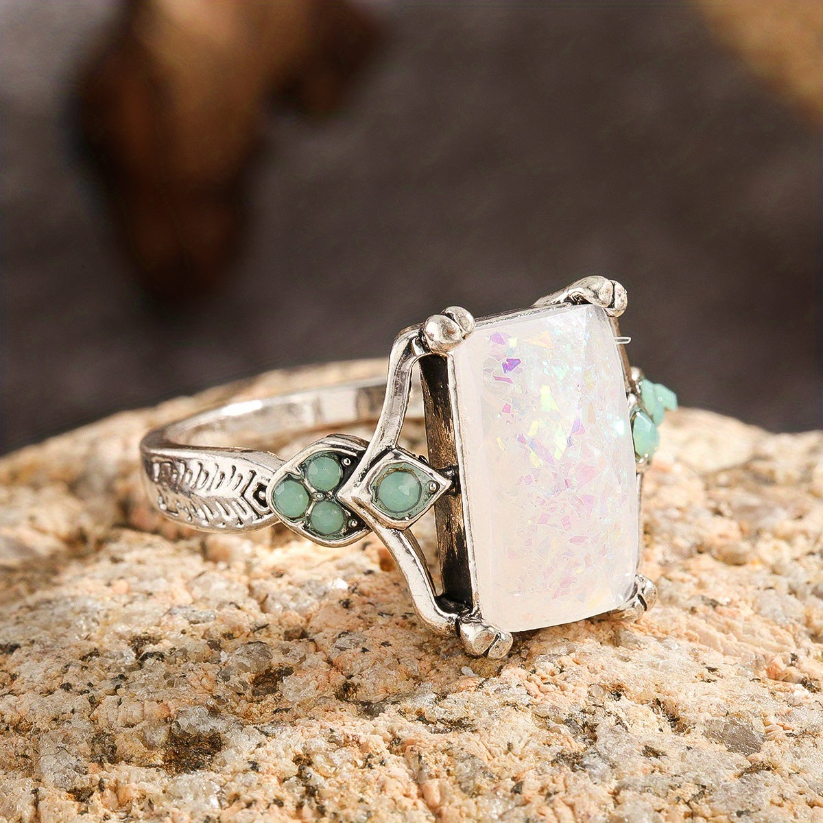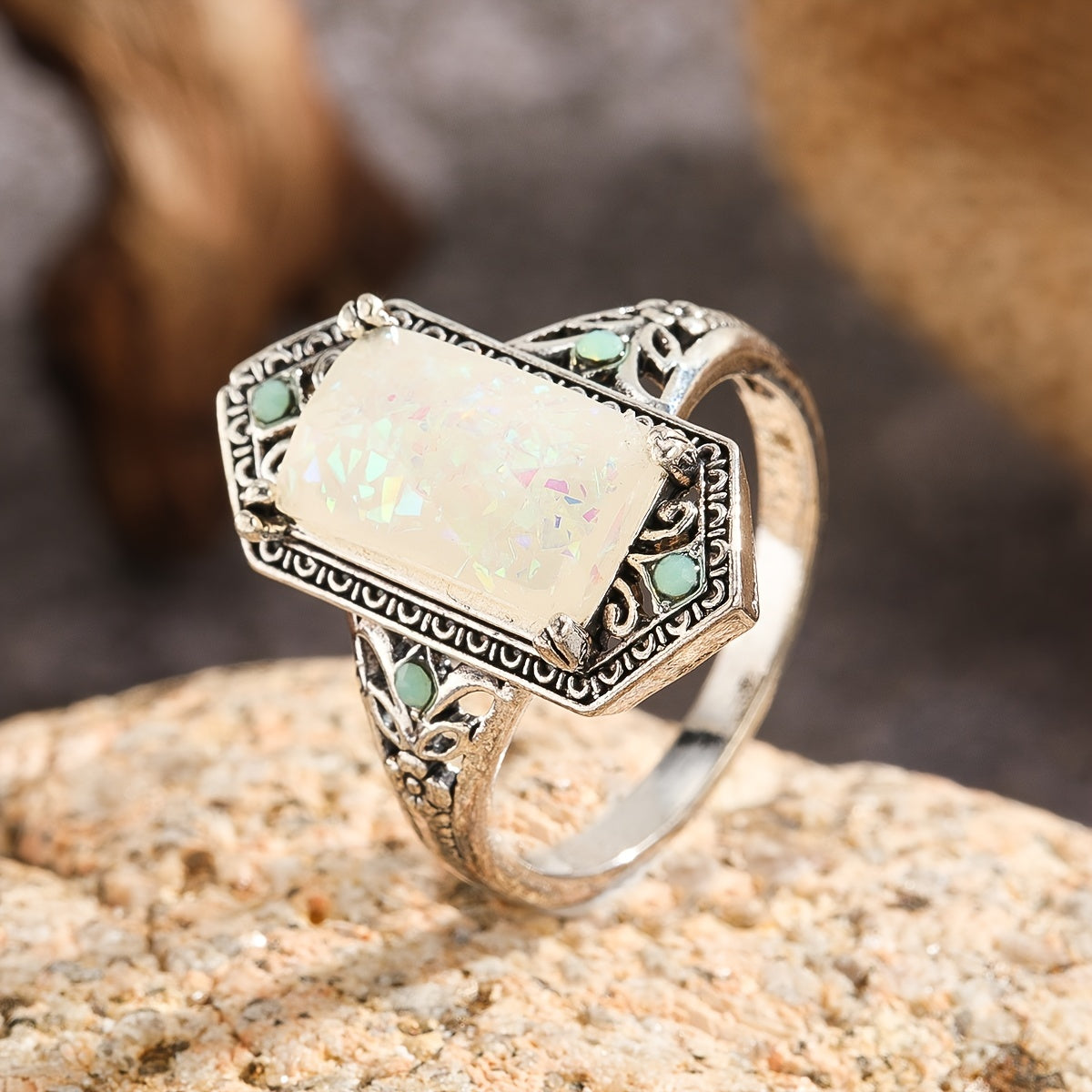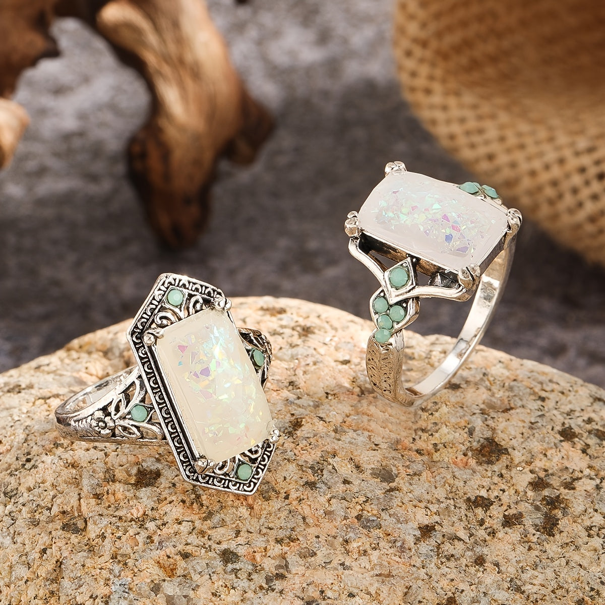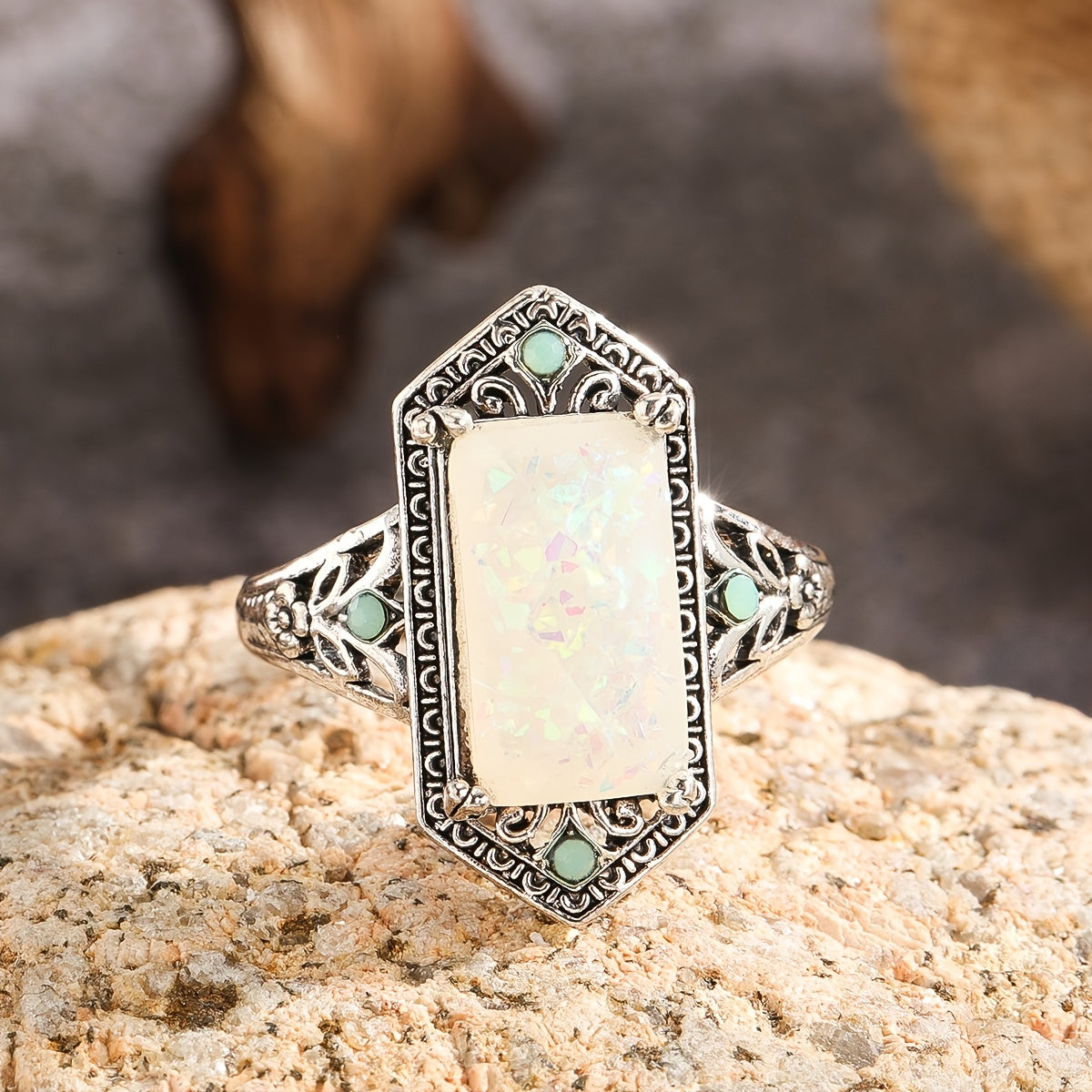 Enhance your style with this beautiful square opal ring in an antique silver setting.
