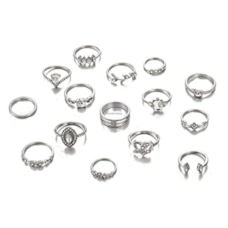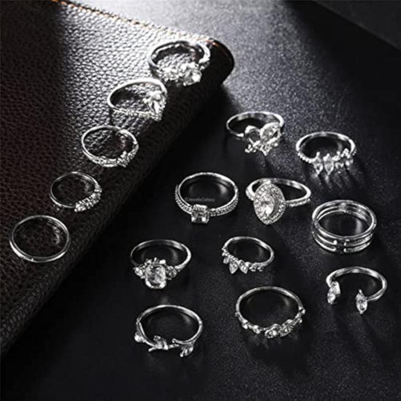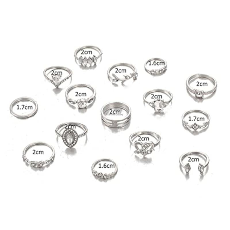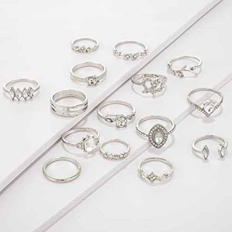 Elevate your style with this exquisite stackable rings set featuring 15 rings with stone studded design. Crafted with silver plating, this set adds a touch of elegance to any outfit.