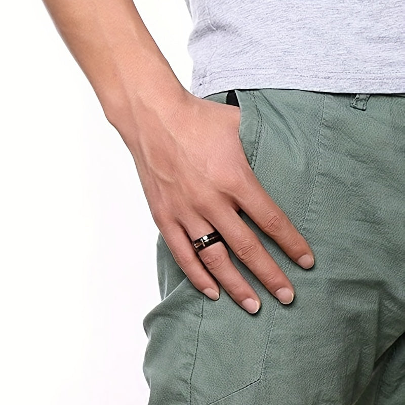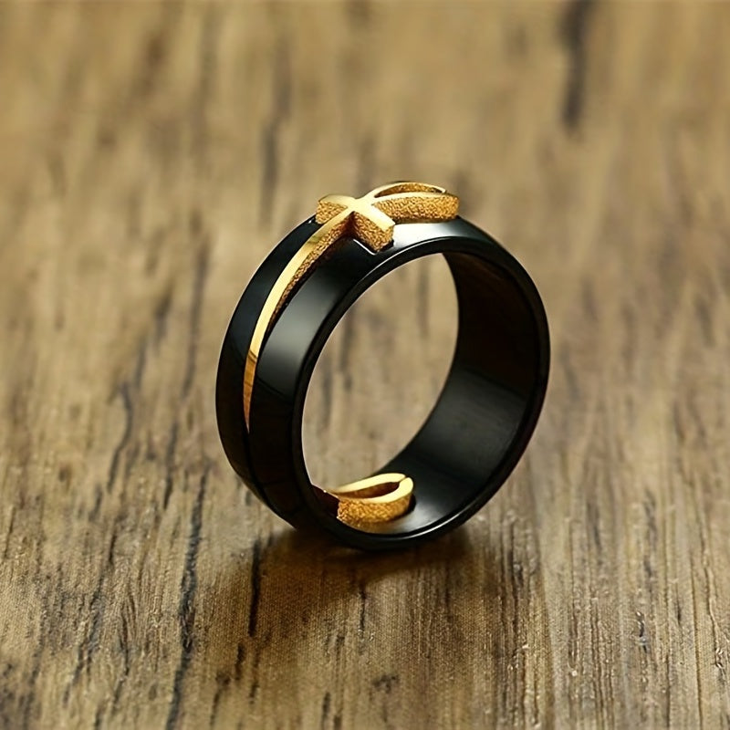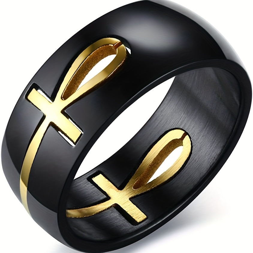 This stainless steel wedding band features a removable 2 tone golden Egyptian Ankh Cross symbol design, perfect for men and boys.