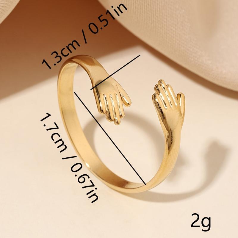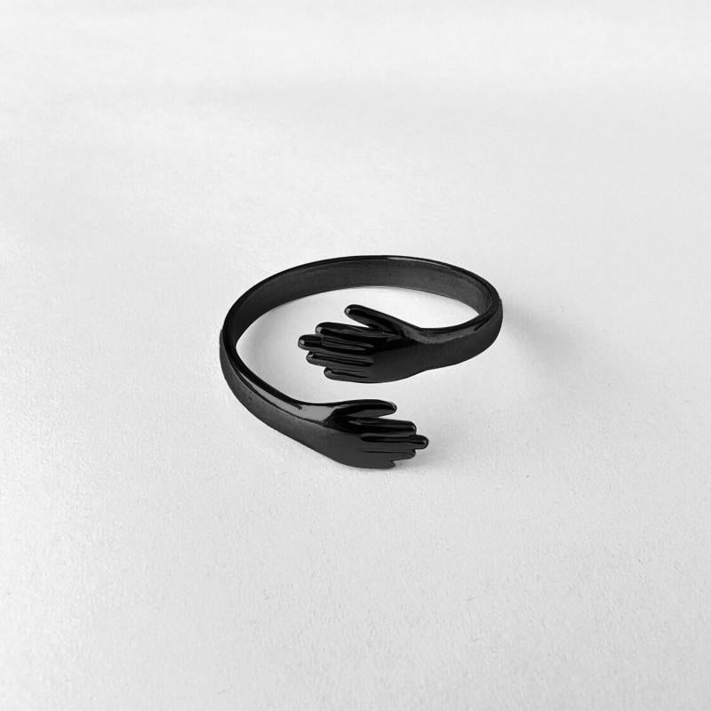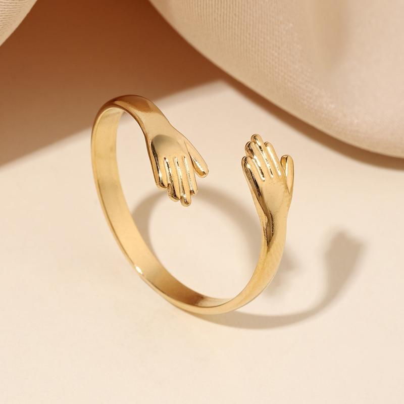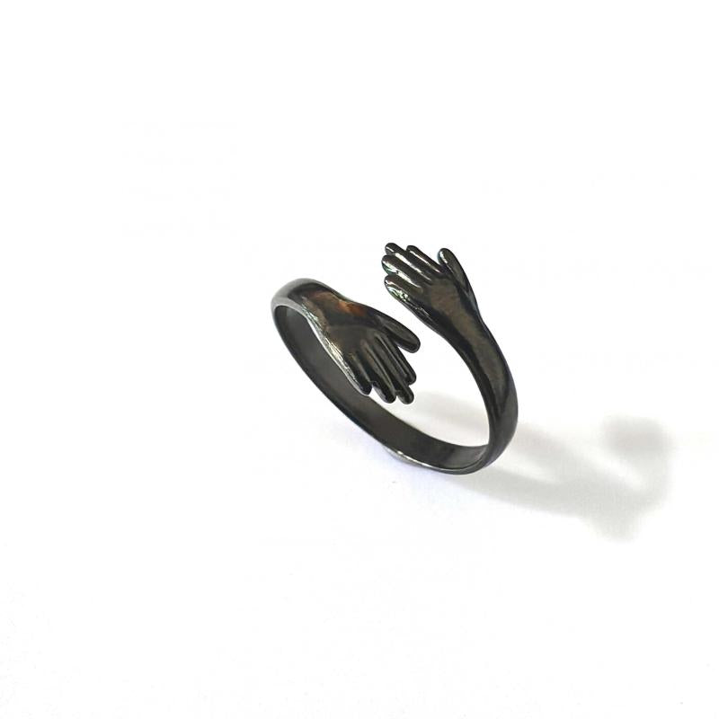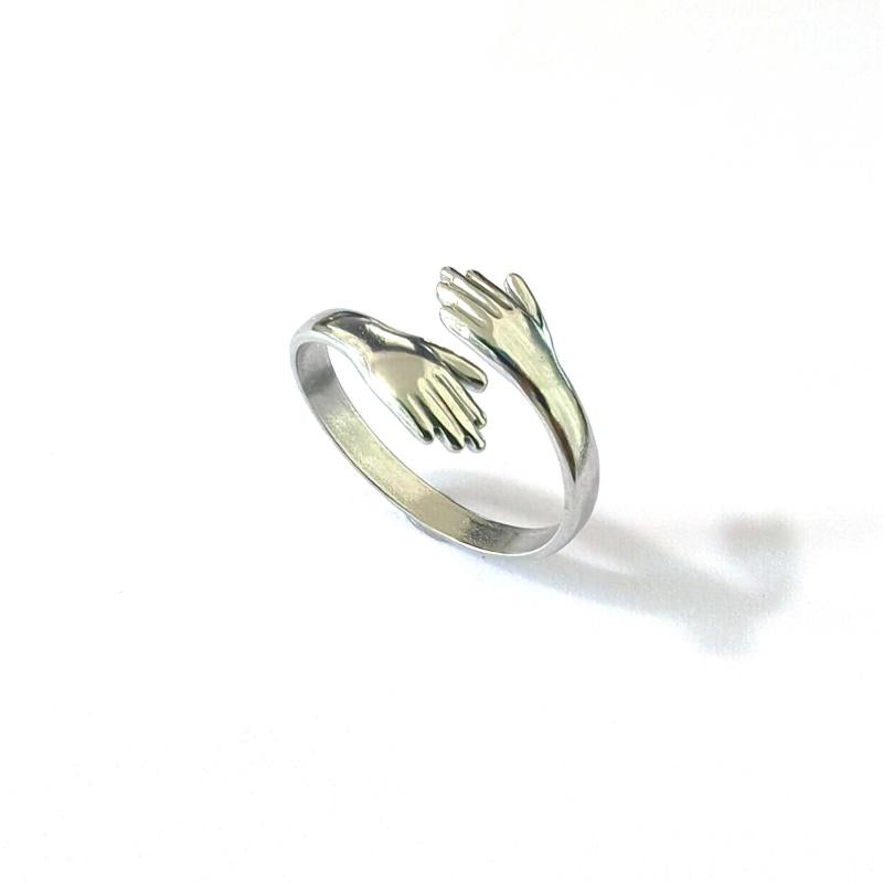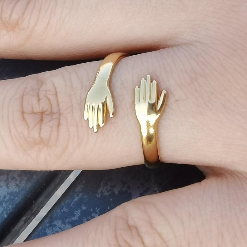 This open adjustable ring features symbolic clasped hands design, representing love and commitment. It is a perfect unisex couple's jewelry for anniversary or wedding gift.