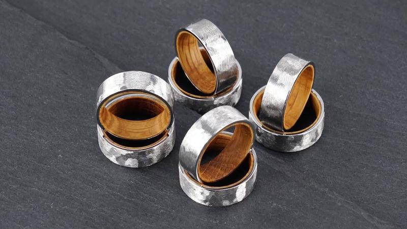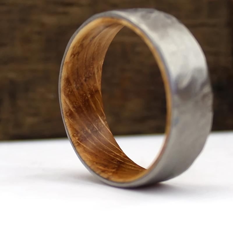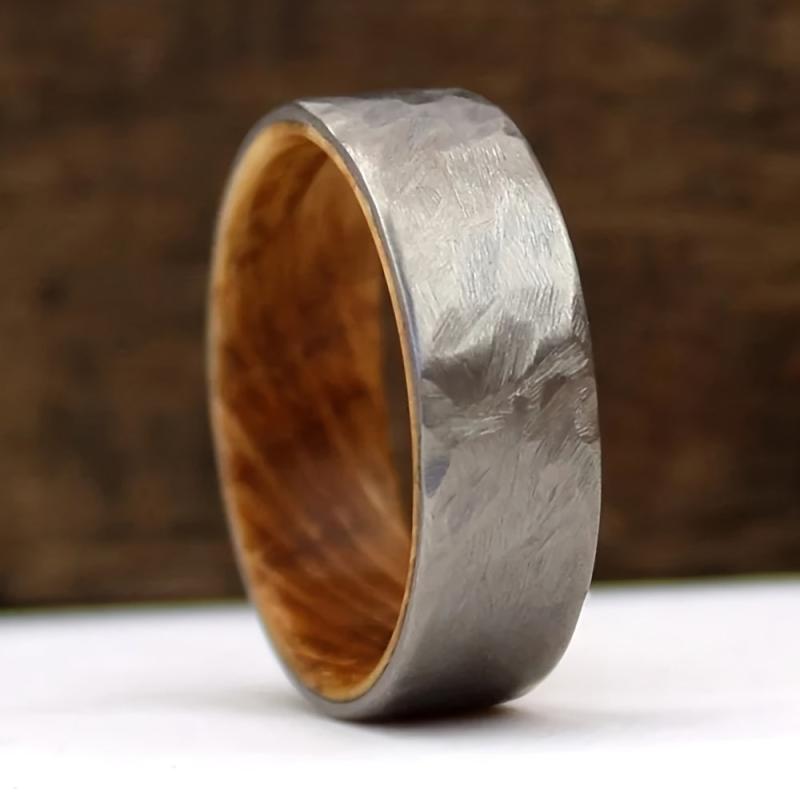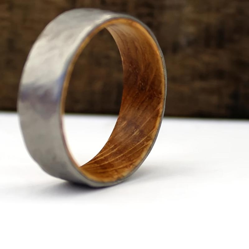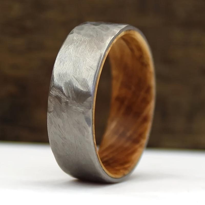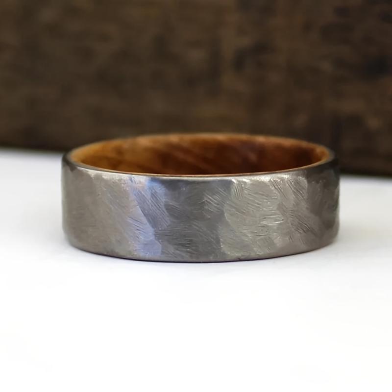 This stainless steel ring features a hammered design resembling whiskey barrel rings. It has an antique silvery finish, making it perfect for daily wear and ideal for special occasions like engagement or weddings.