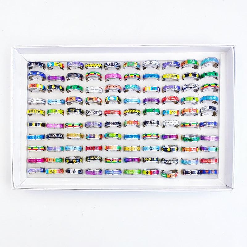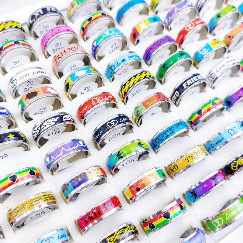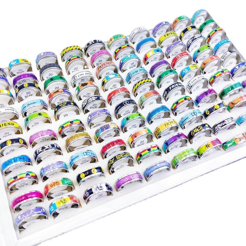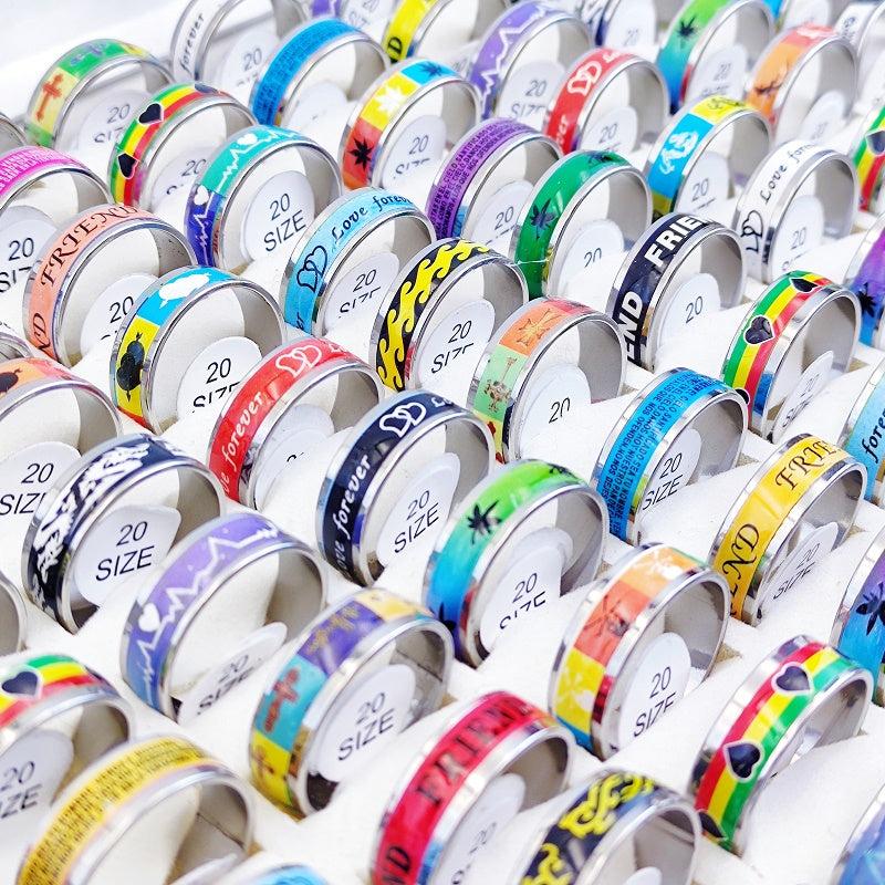 These love heart stainless steel rings are perfect for both men and women. The mixed style and colorful stripe design make them unique and eye-catching. Available in 20, 50, or 100 piece lots.