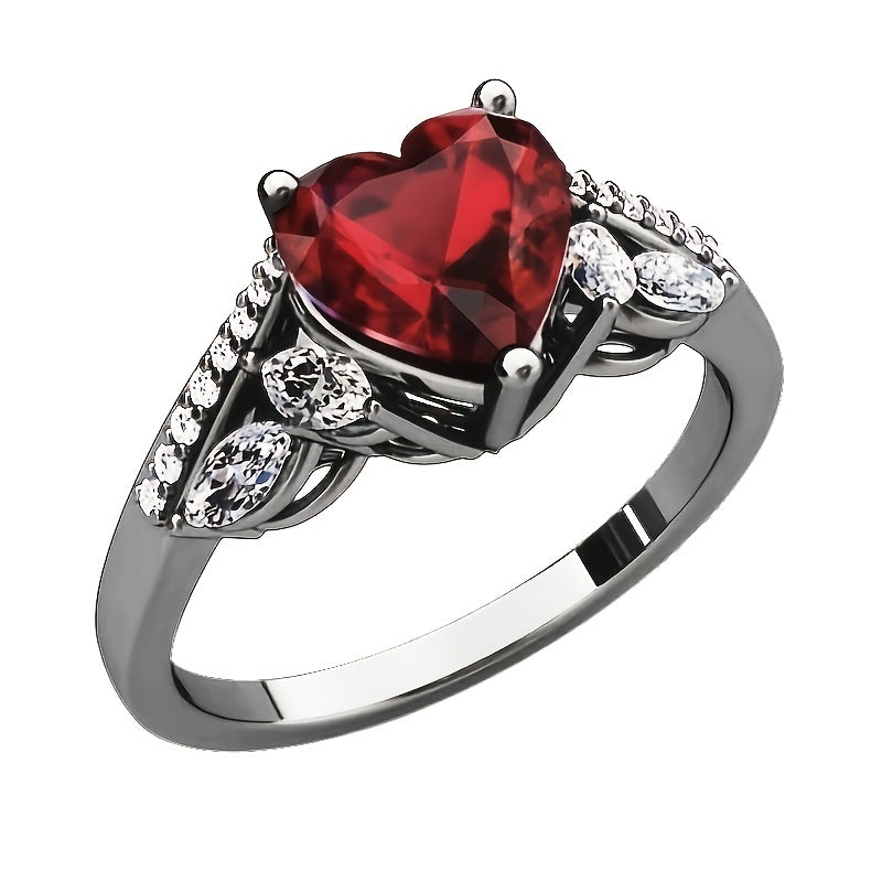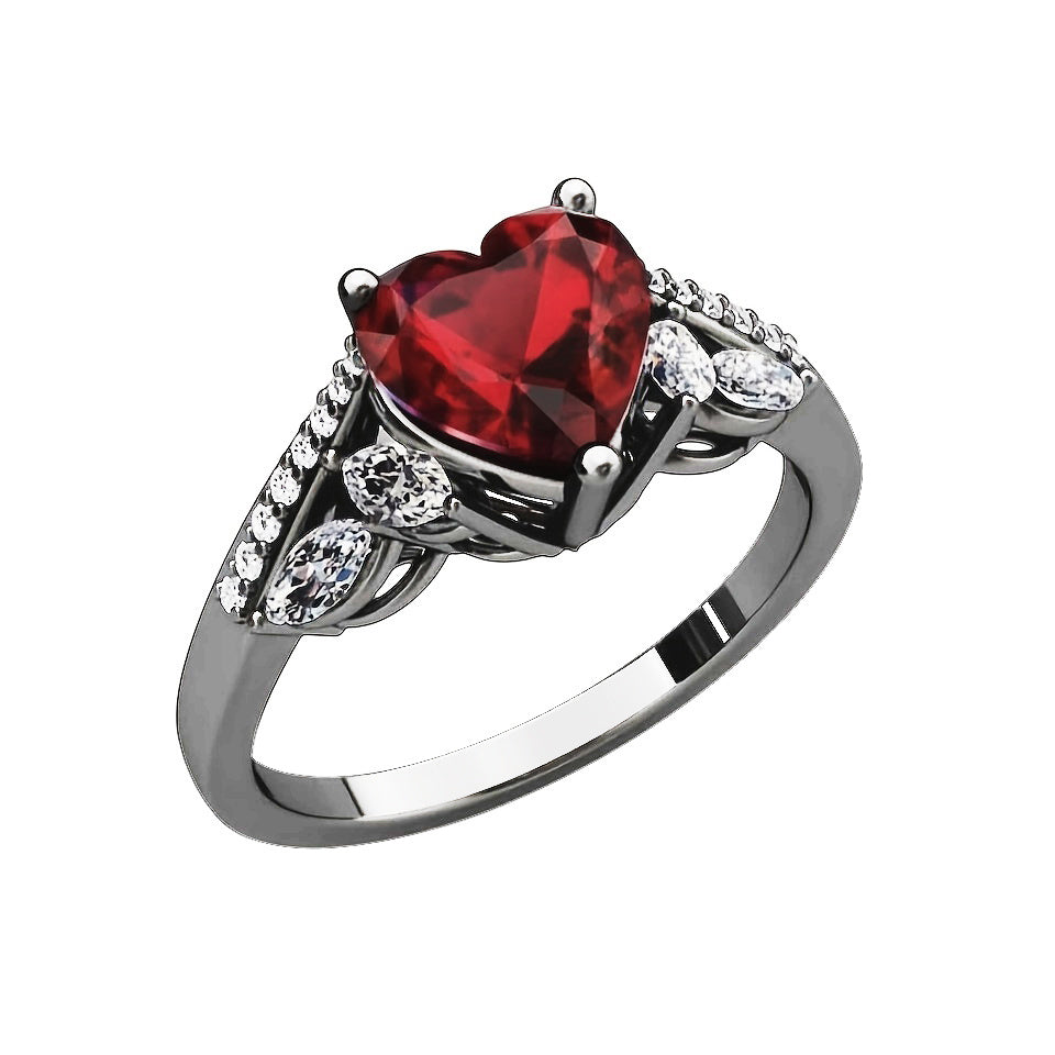 This pair of matching rings features a heart-shaped red gemstone design, perfect for couples.