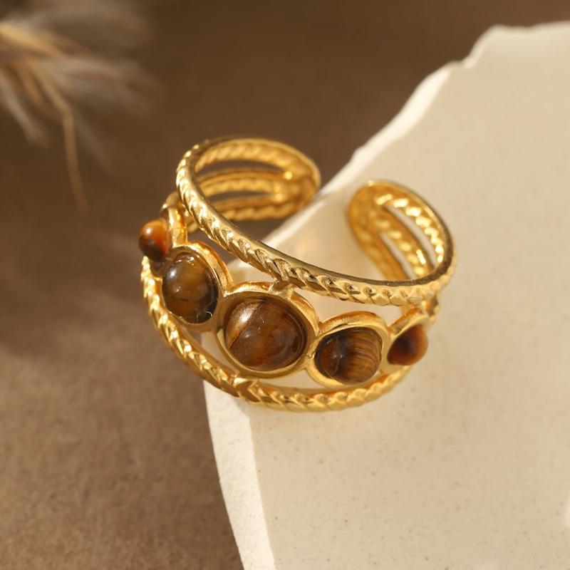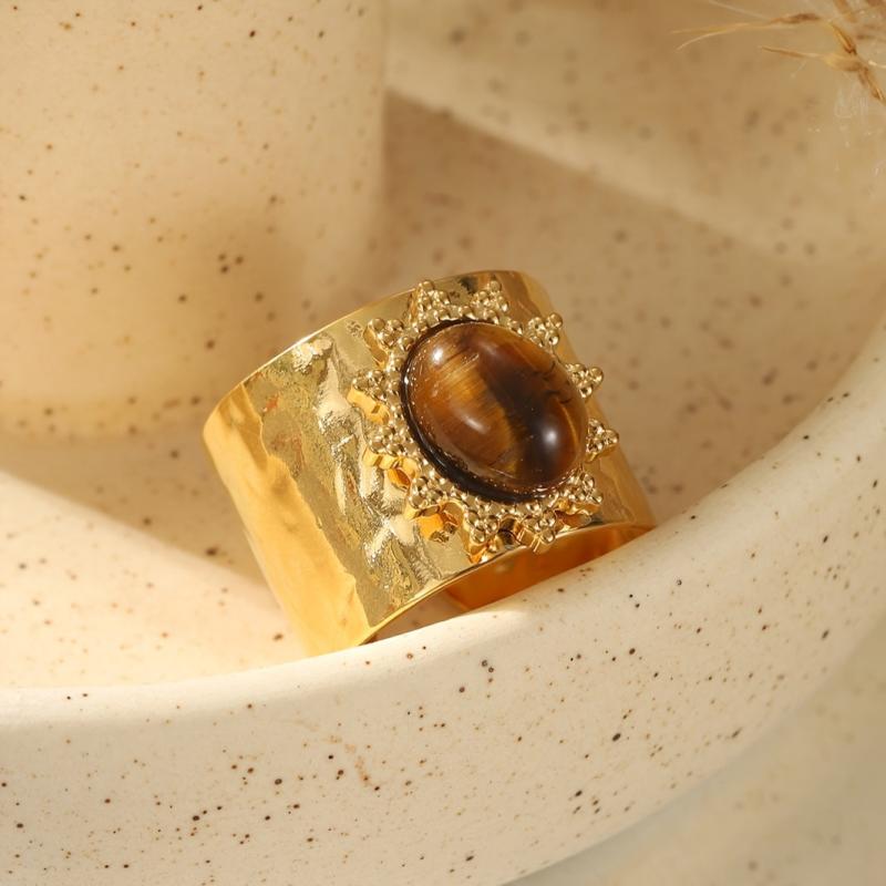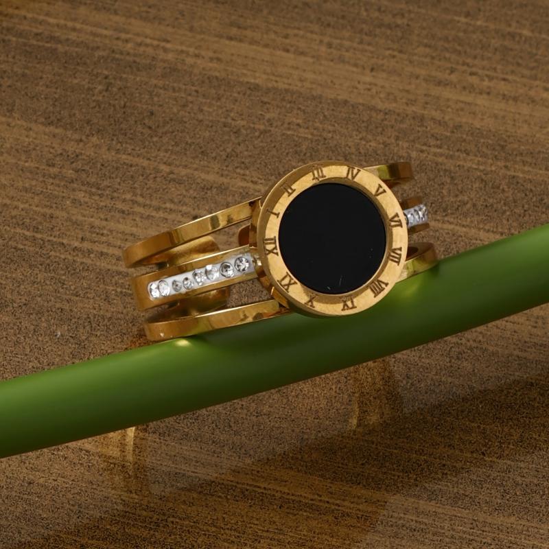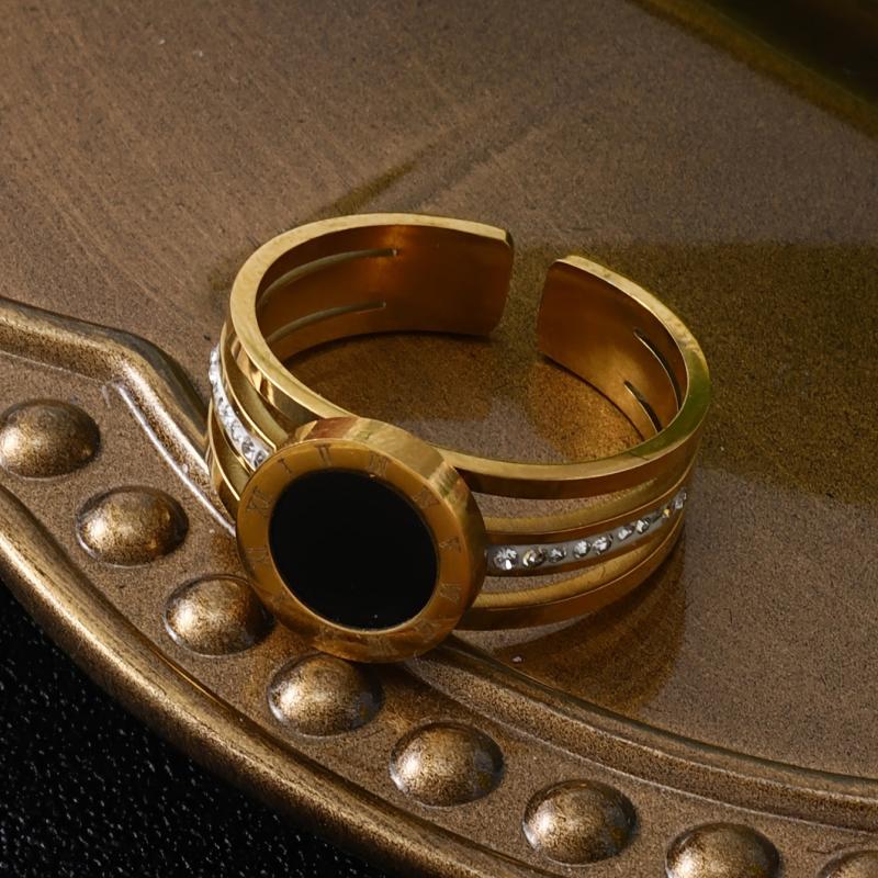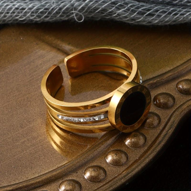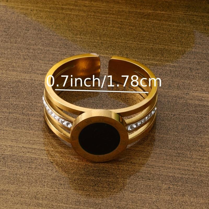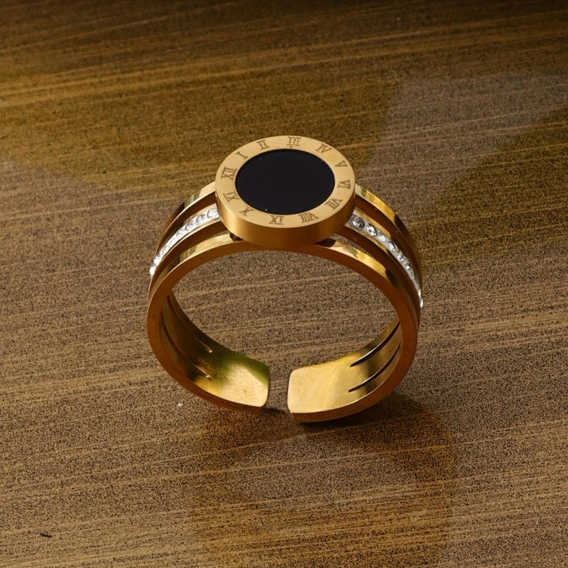 This stylish stainless steel statement ring features a centerpiece and crystal embellishments, making it a fashionable accessory for daily wear and vacation occasions.