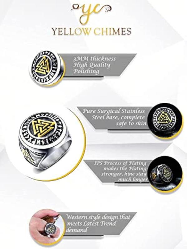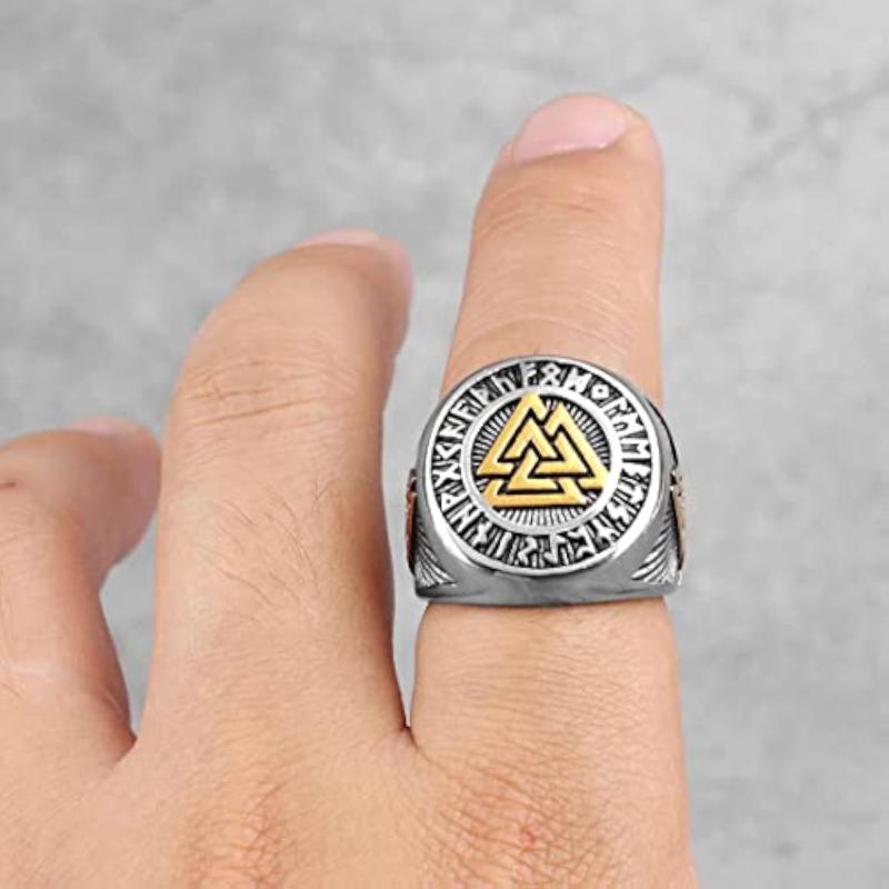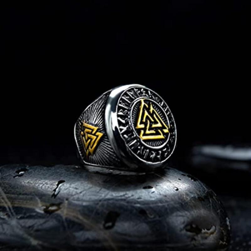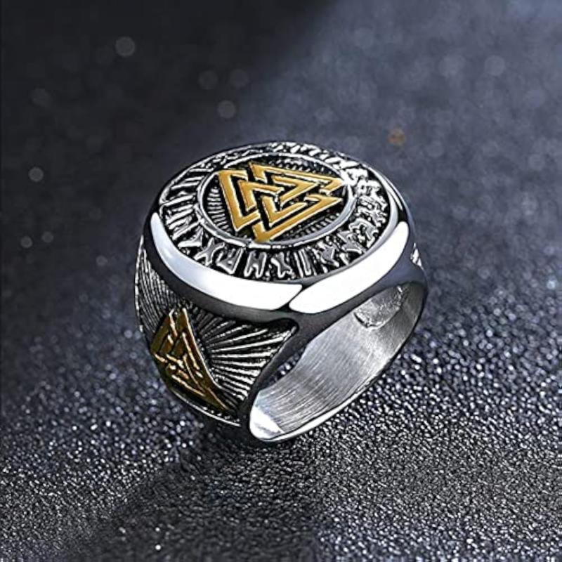 This stainless steel ring features the Valknut symbol with a rune circle design inspired by Odin. It is perfect for men and boys.