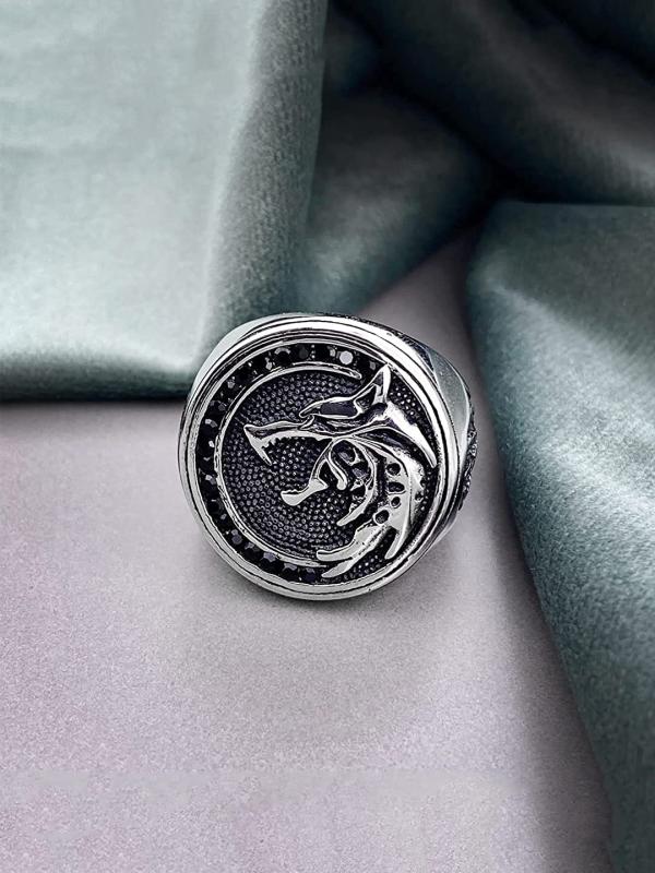 This silver ring features a Viking warrior design with a wolf head, perfect for hunters and wizards.