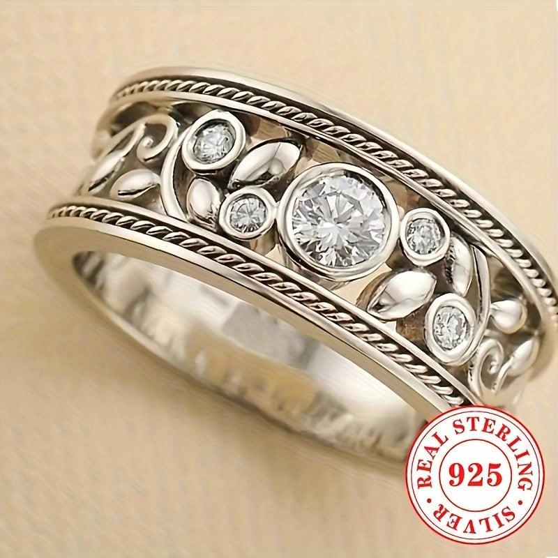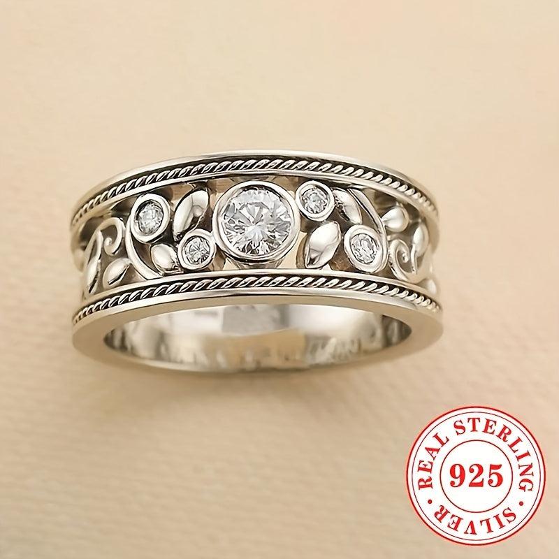 This vintage-inspired wide face ring is made of S925 sterling silver and features a leaf cutout design set with synthetic zirconia. Perfect for everyday wear or special occasions. Makes a great anniversary or party gift for ladies.