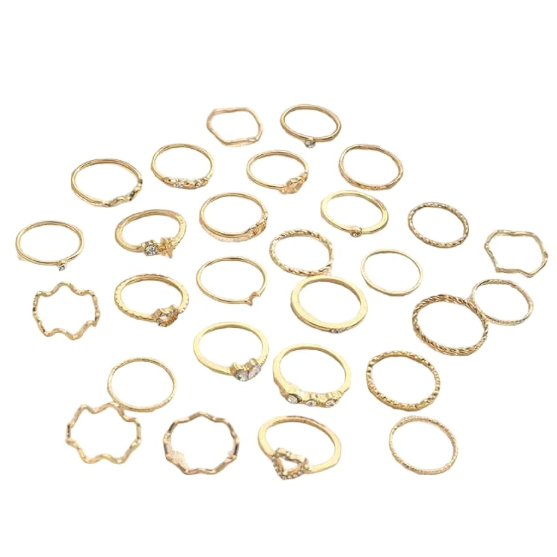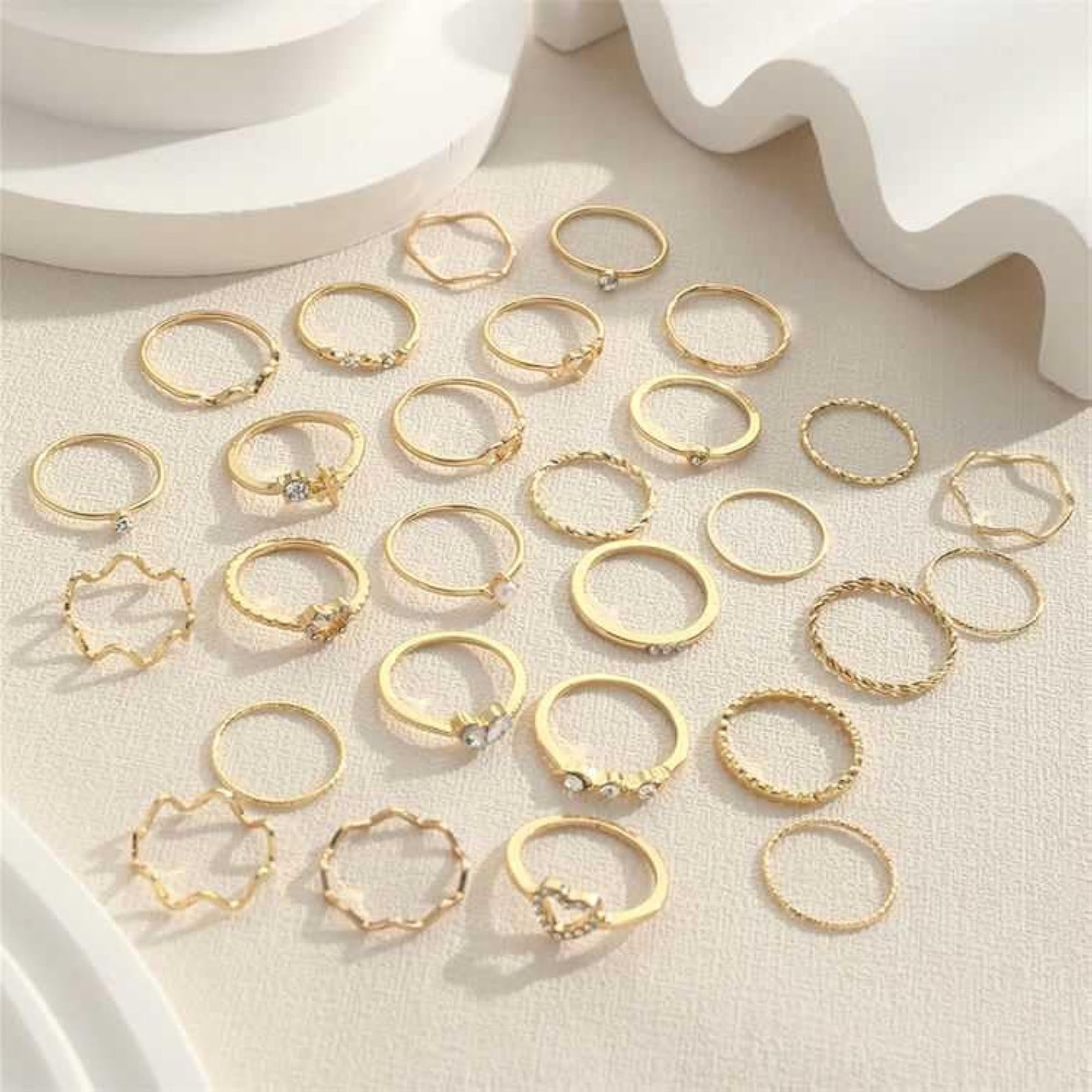Elevate your look with this set of 28 stacking rings featuring trendy geometric designs. Each ring is plated for a luxurious finish.