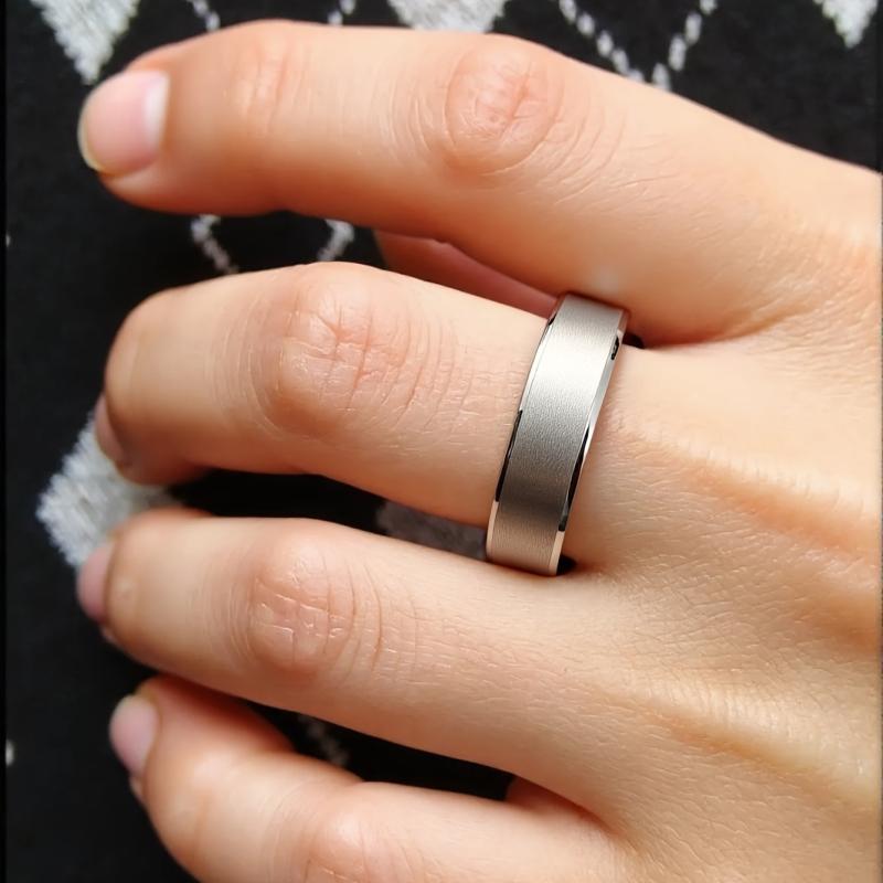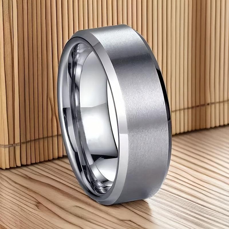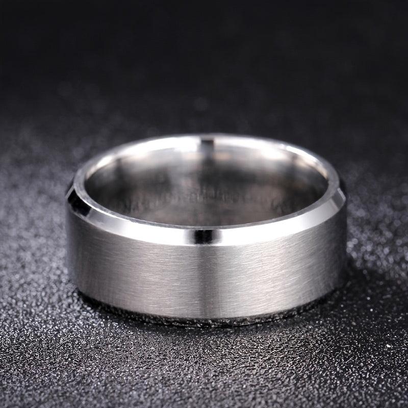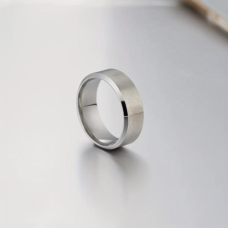 Add a touch of elegance with this versatile 8mm matte beveled ring. Perfect for both men and women, this silver band is a must-have accessory.