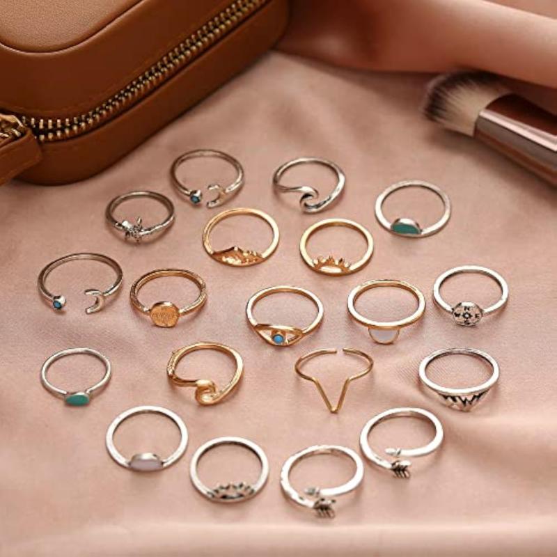 Enhance your boho style with this set of 19 fashionable metal midi finger rings. Mix and match to create stunning looks!