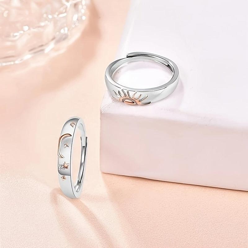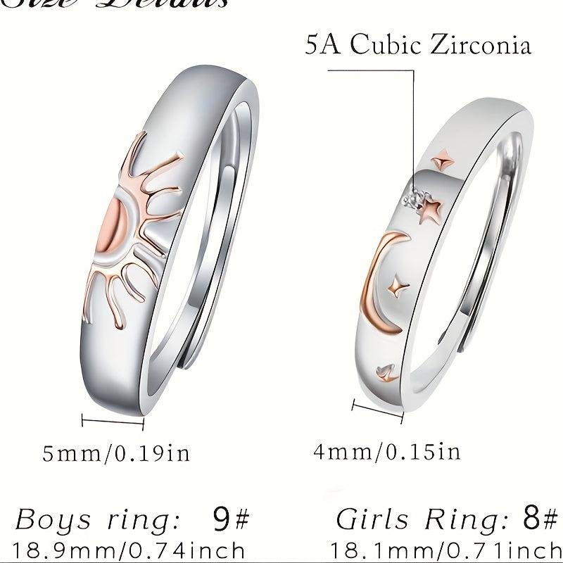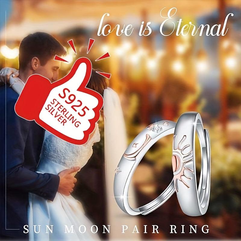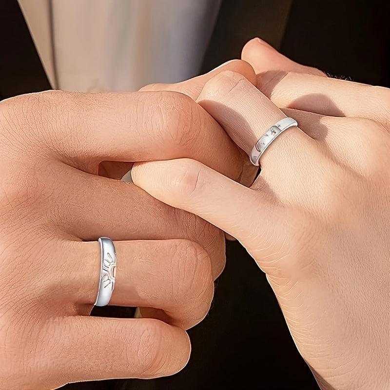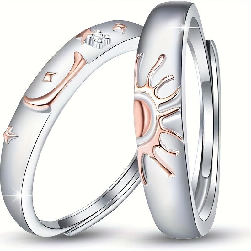 These couple rings feature a sun and moon design crafted from 925 sterling silver. The rings are adjustable and perfect for engagements. Show your unique bond with these matching rings.