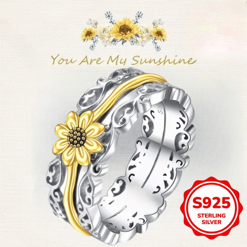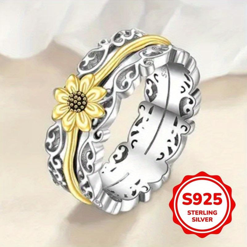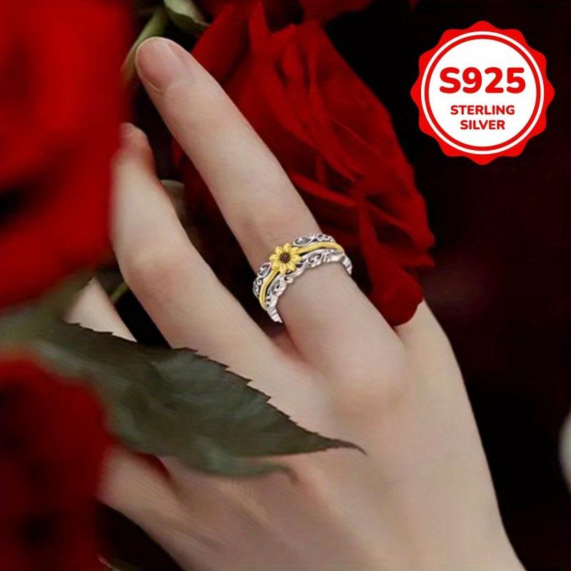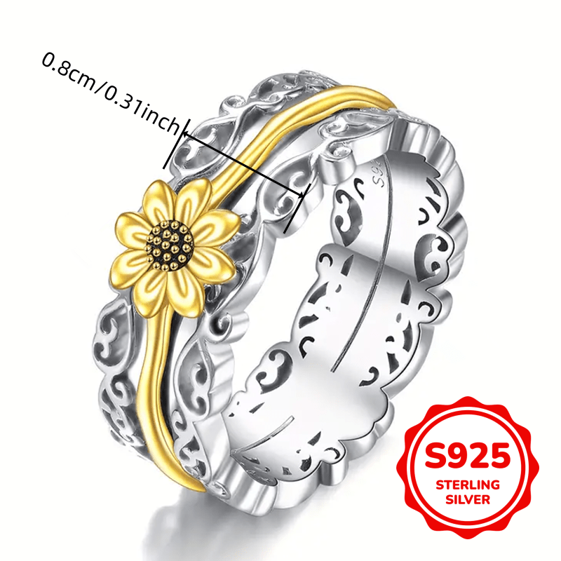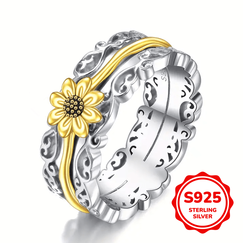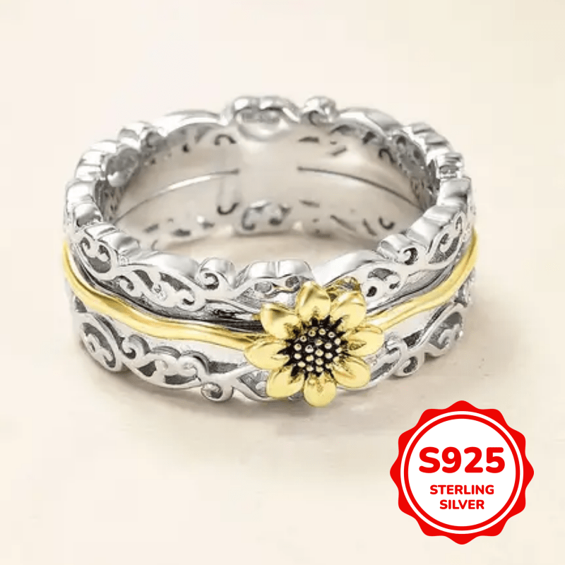 Add a touch of vintage charm to your look with this sunflower ring. Made of 925 sterling silver, it features a bohemian floral band with golden accents, perfect for casual attire, vacation, or party wear.