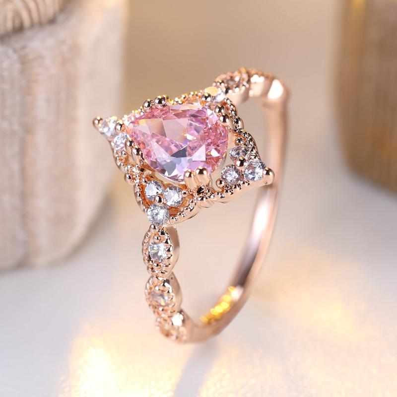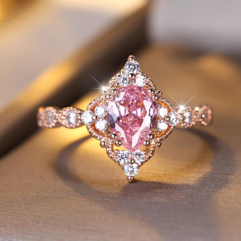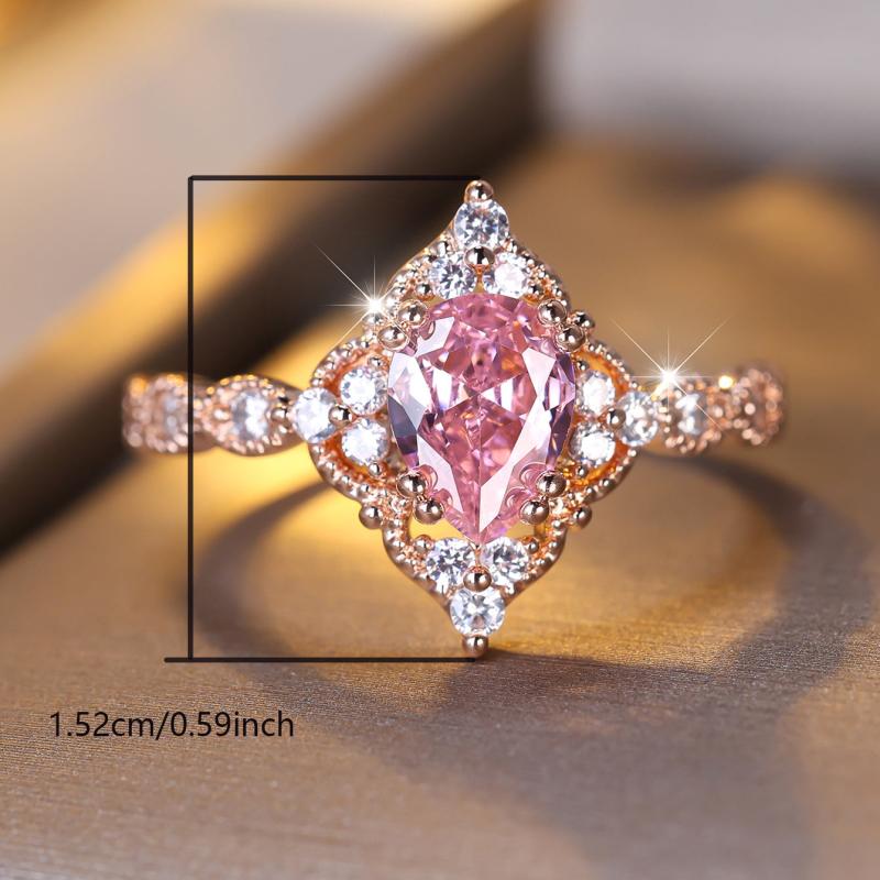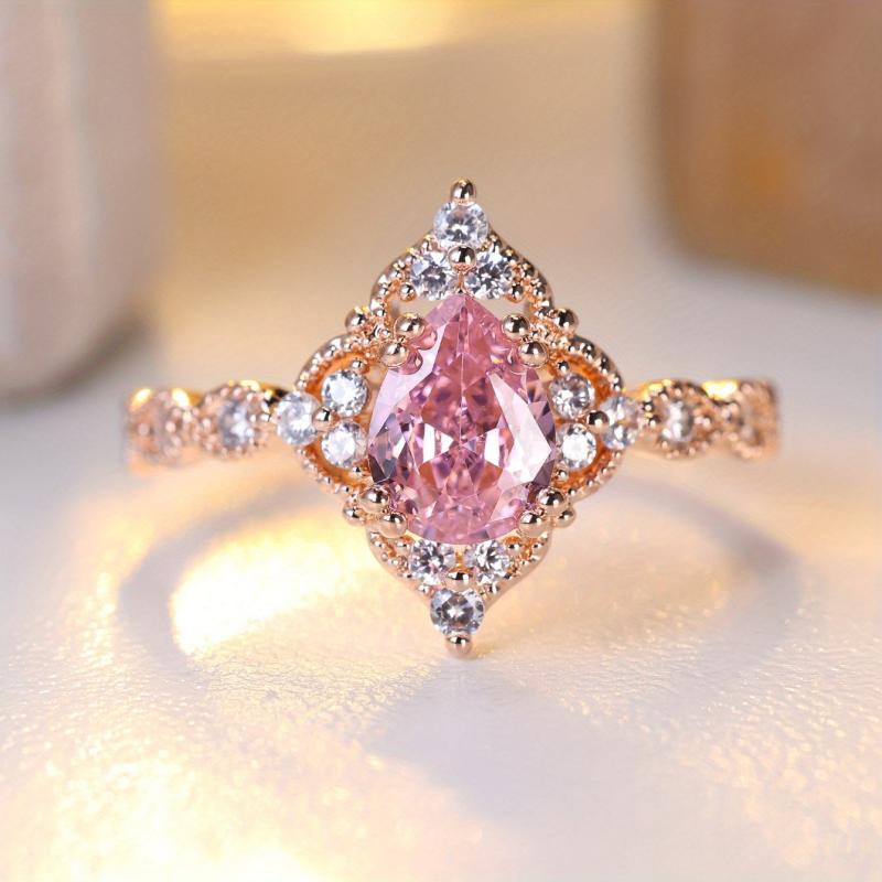 Elegant teardrop pink zirconia engagement ring with a copper band and synthetic accents. Perfect for daily wear or special occasions. Features non-tarnish plating for long-lasting shine.