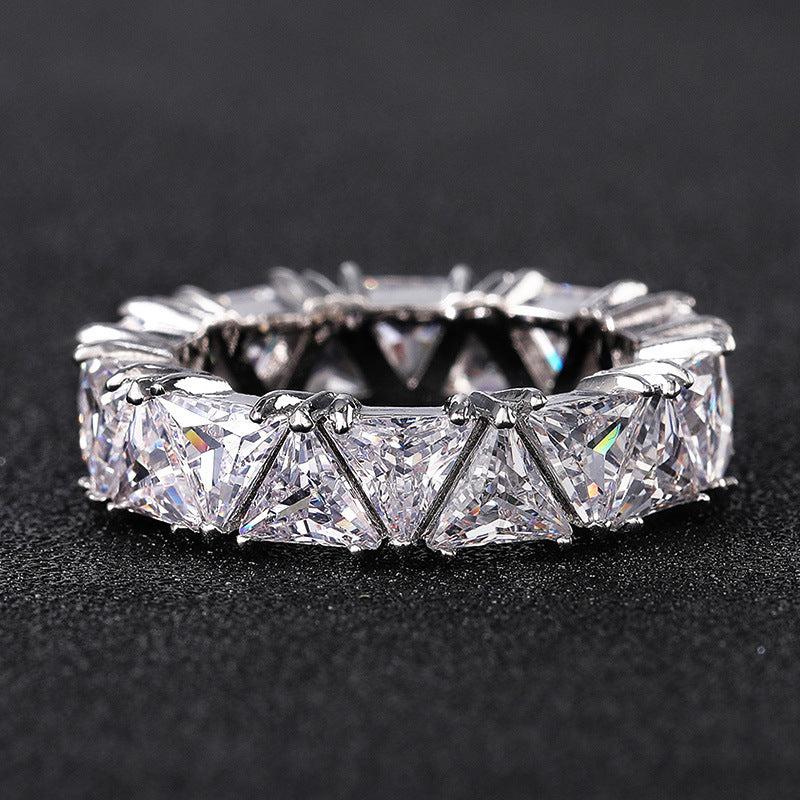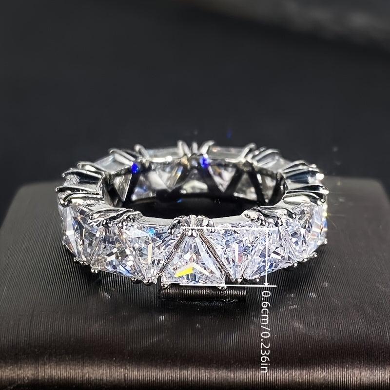 This elegant engagement ring features a triangle cut synthetic zirconia stone, perfect for a romantic proposal. Show your love with this stunning ring.
