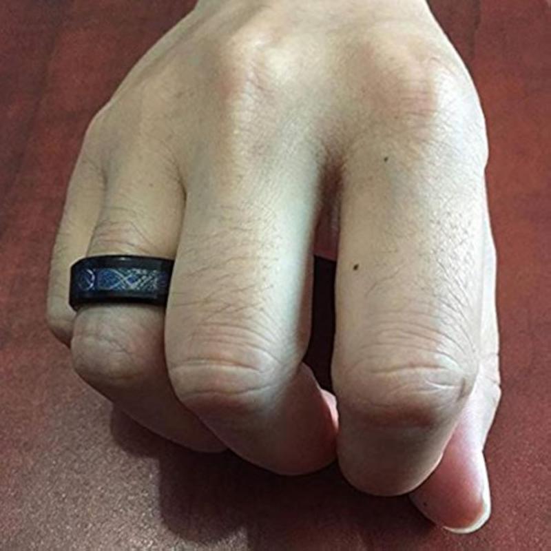 This stunning wedding band features a silvering Celtic dragon design on black carbon fibre. Made of durable tungsten carbide, this ring is both stylish and long-lasting.