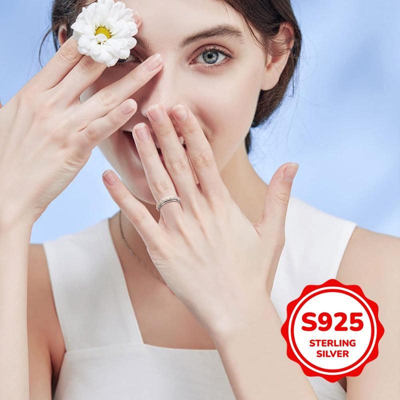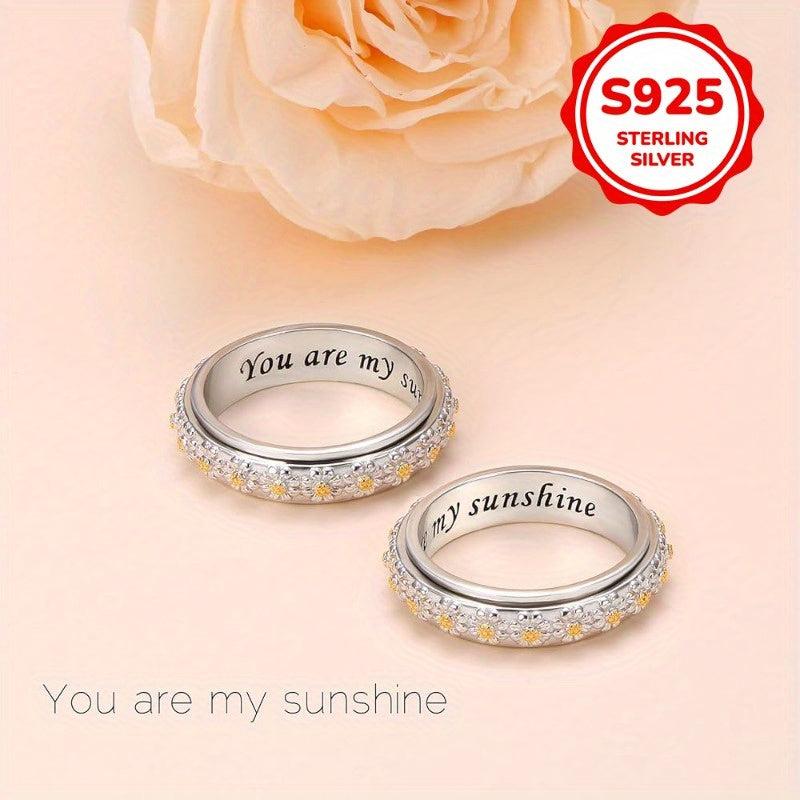 This rotatable anxiety ring features a two-tone design with a daisy flower accent. Made of 925 sterling silver, this casual holiday ring is perfect for everyday wear.