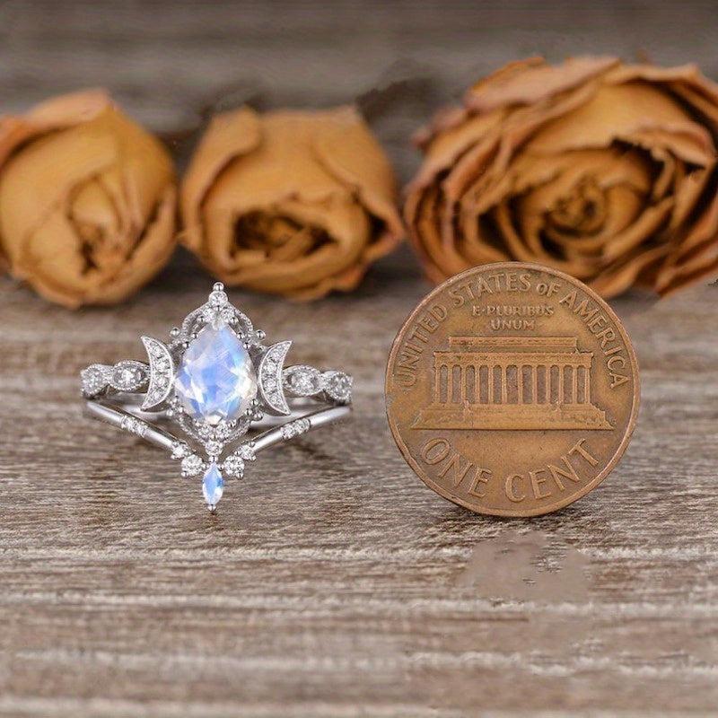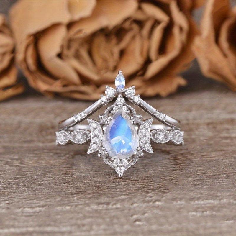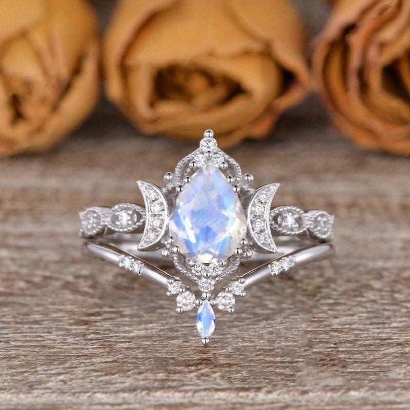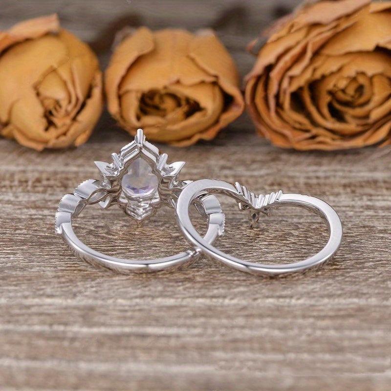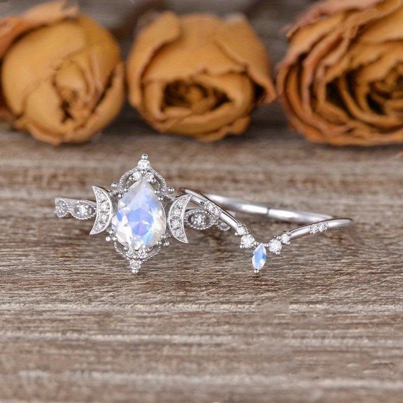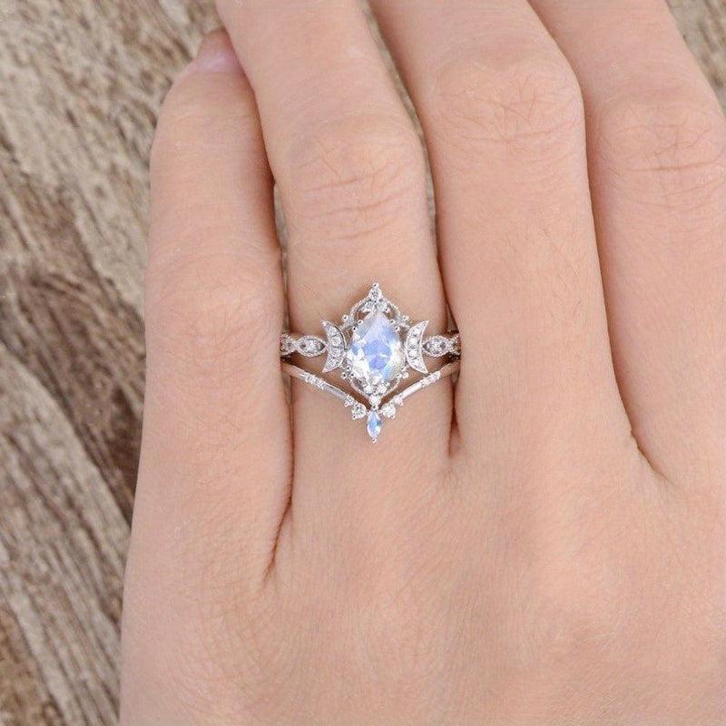 This enchanting engagement ring set features a stunning pear shaped moonstone stone. The fairy design adds a whimsical touch to this beautiful bridal set.