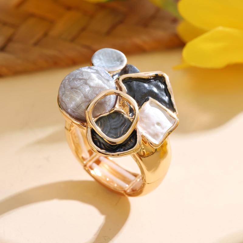 Add a pop of color to your outfit with this vibrant and turquoise geometric ring. Made of zinc alloy with KC golden plating, this bohemian-style ring features an elastic band and enamel detailing. Perfect for spring and summer!
