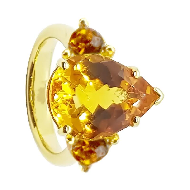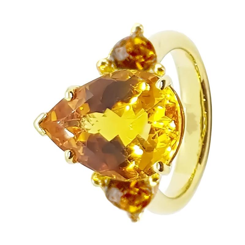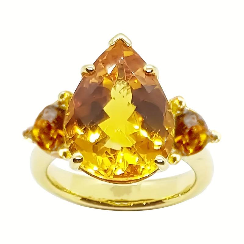 This 14k gold plated ring features three golden yellow synthetic zirconia stones in teardrop and prong setting, perfect for weddings and anniversaries.