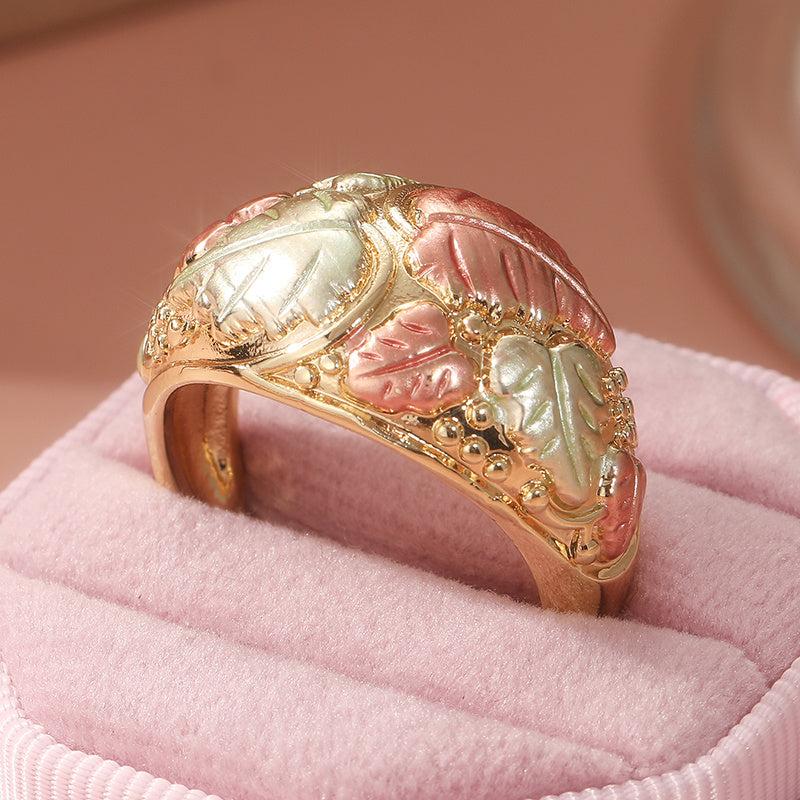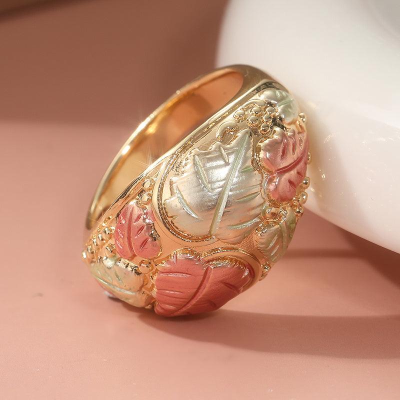 This 14K golden plated leaf ring with pink and green enamel cubic zirconia accents is perfect for daily wear or as a gift. It's a versatile accessory that adds a touch of vintage boho charm to any outfit.