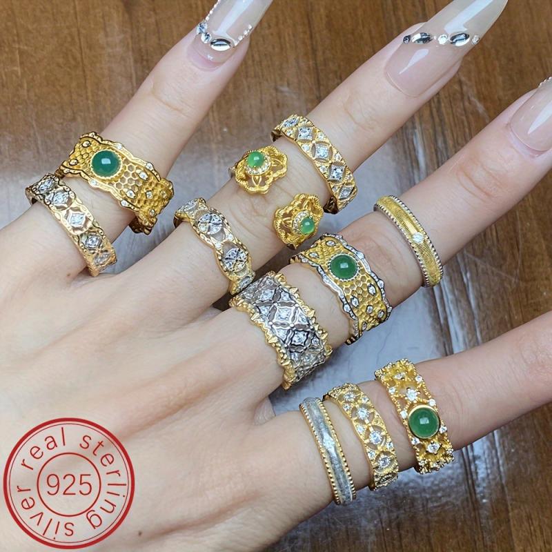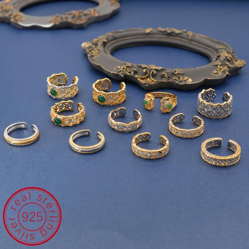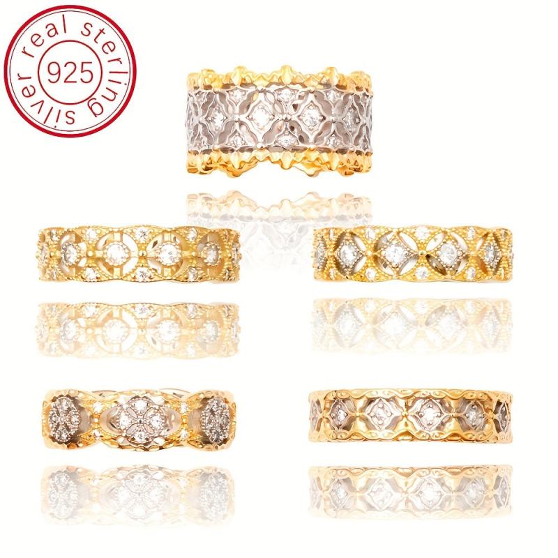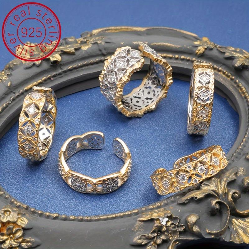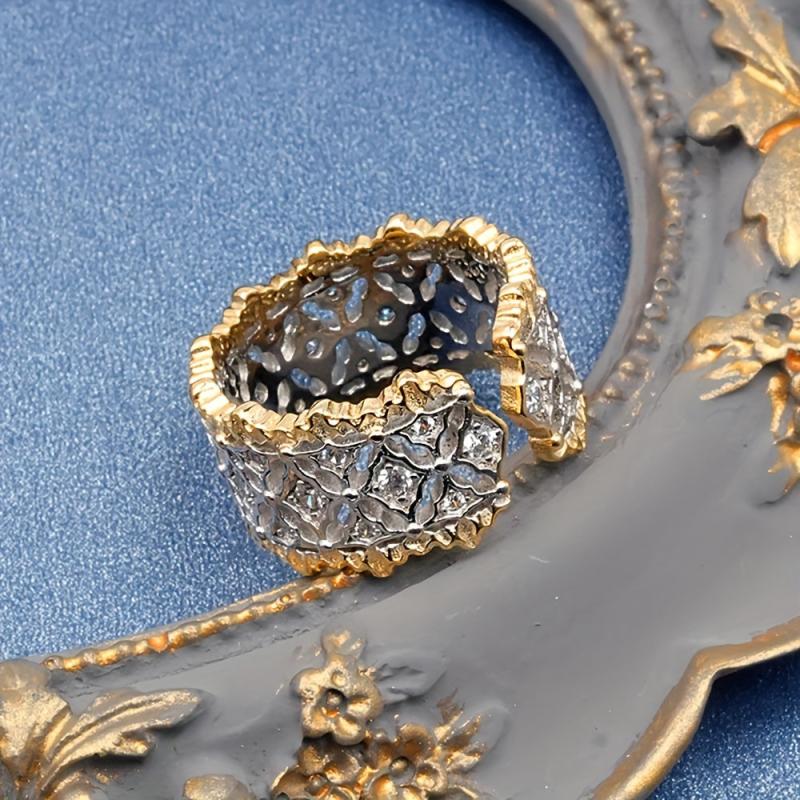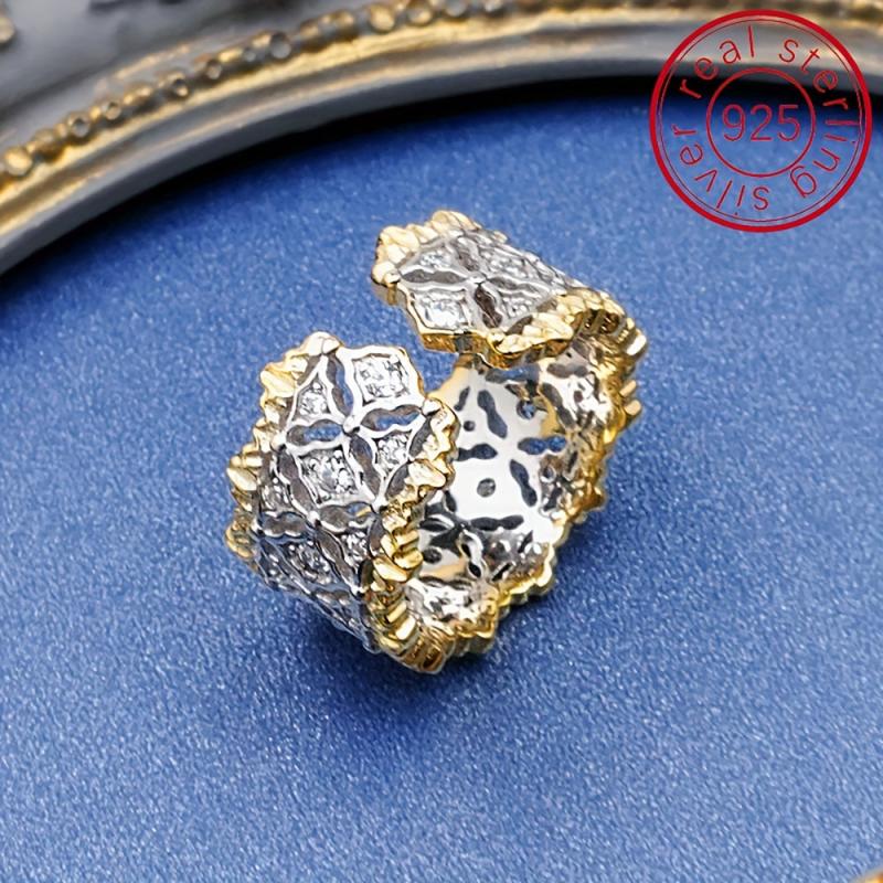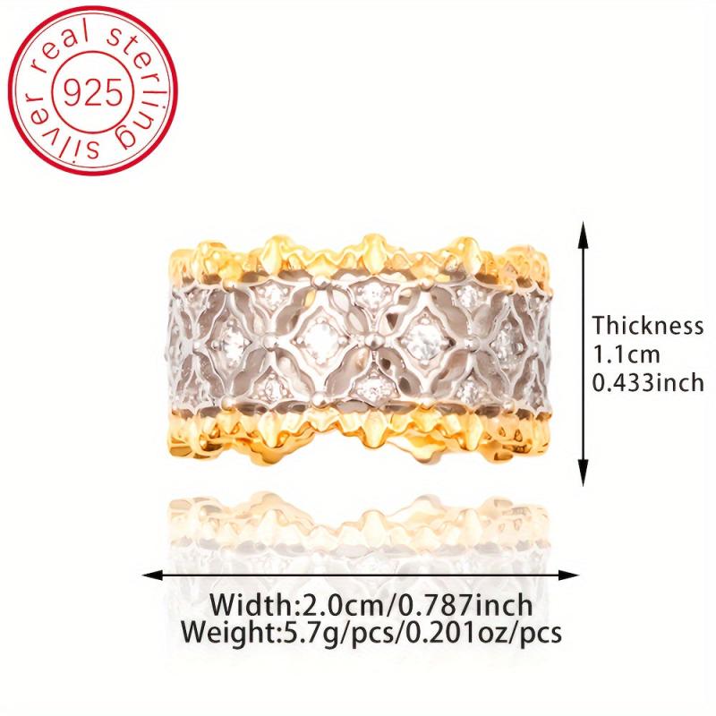 This open cuff ring is made of S925 sterling silver with synthetic zirconia in a lace hollow carved design. The April birthstone adds a touch of elegance. Versatile and ideal for all seasons.