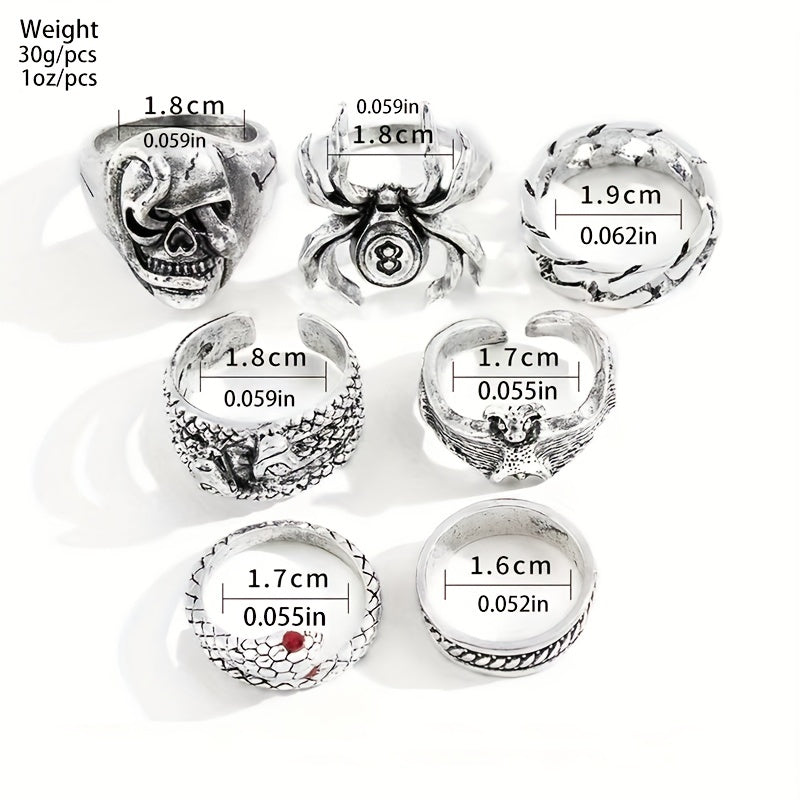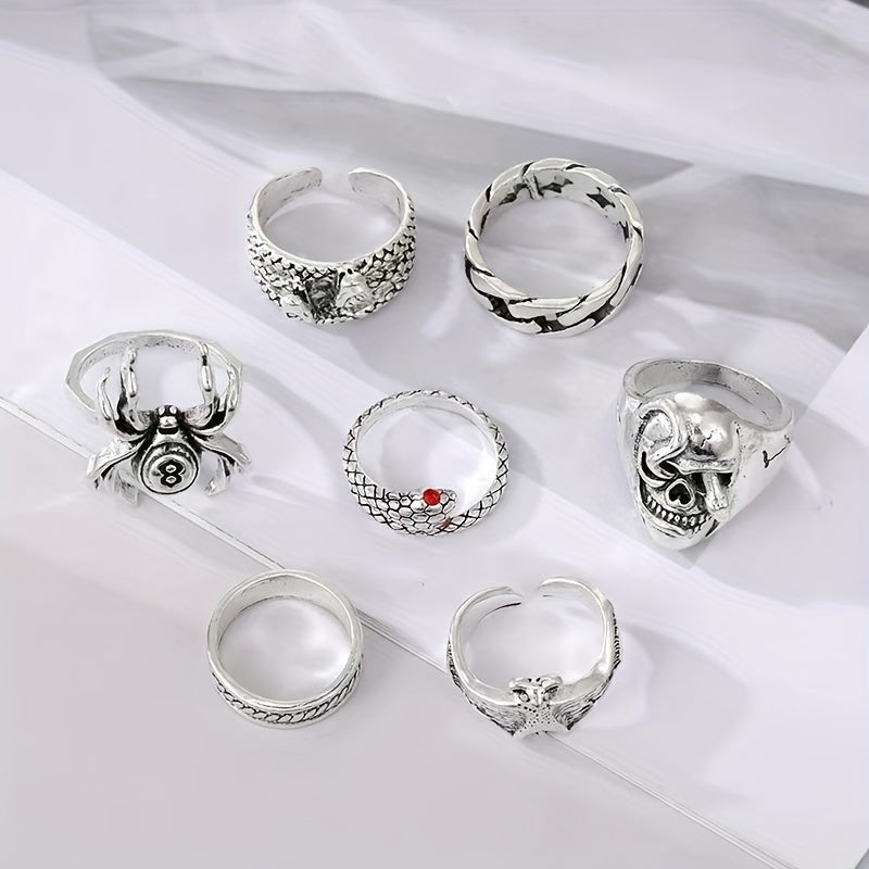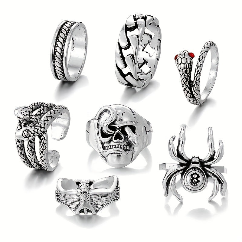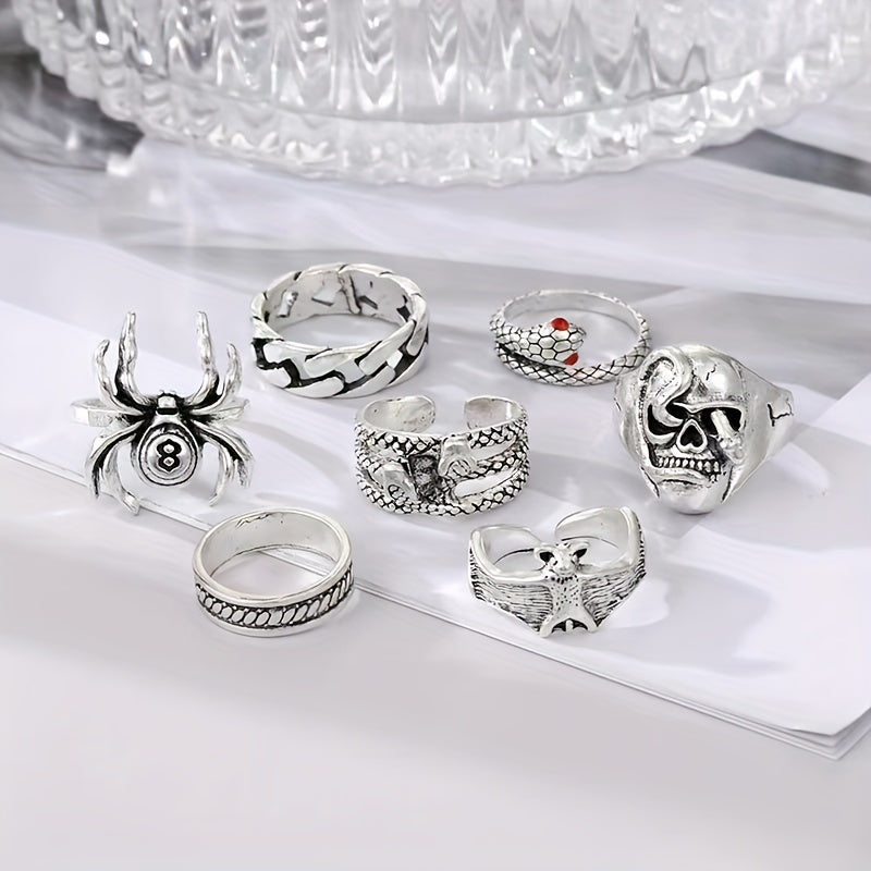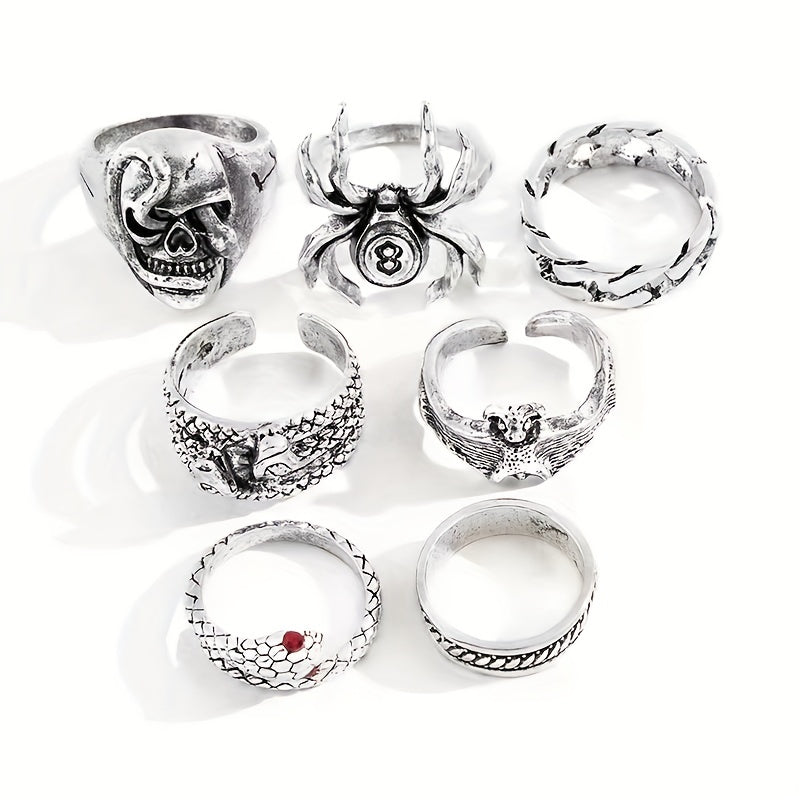 Embrace a vintage street style with this set of 7 rings featuring spider, bat, and snake designs. These stacking rings are perfect for adding a bold touch to your look.