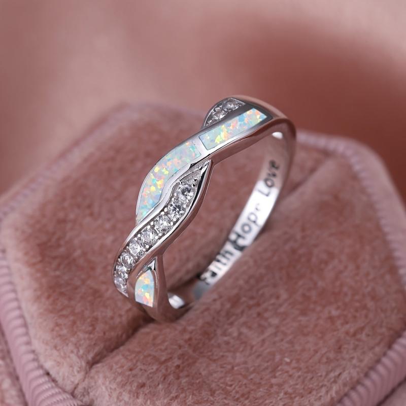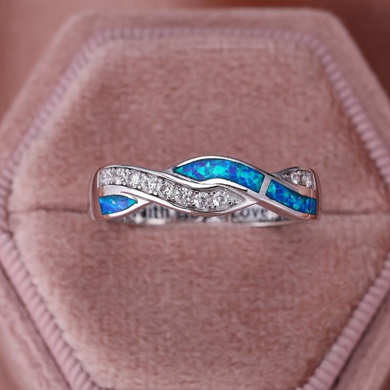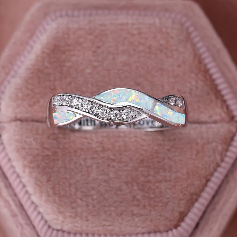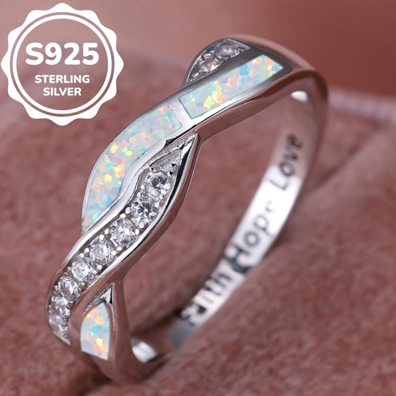925 Silver Plated Twist Wave ring featuring a synthetic opal and cubic zirconia, perfect for daily wear or special occasions.