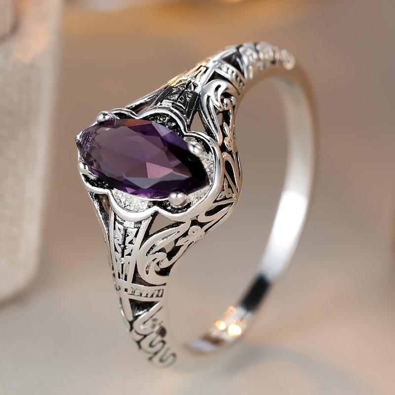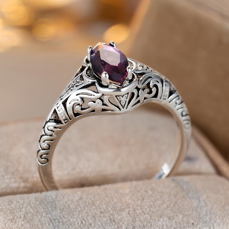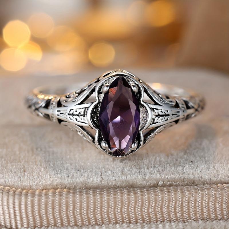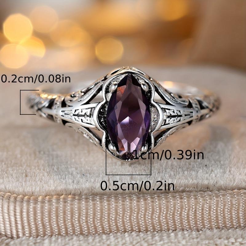 This vintage engagement ring features a filigree engraved copper band with a stunning synthetic zircon gemstone. The band is uncoated and perfect for all seasons, making it ideal for weddings and other occasions.