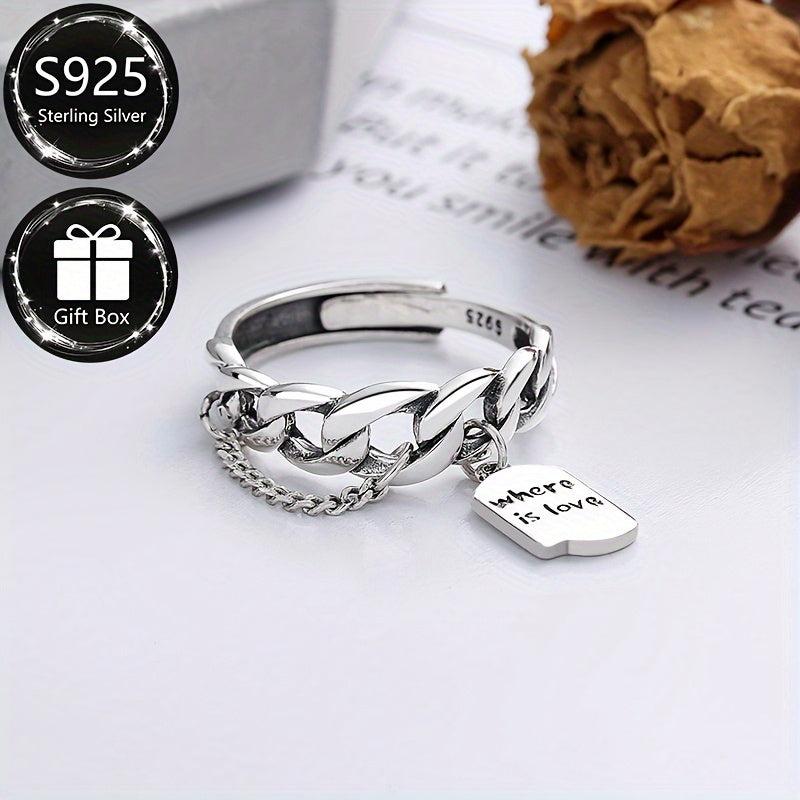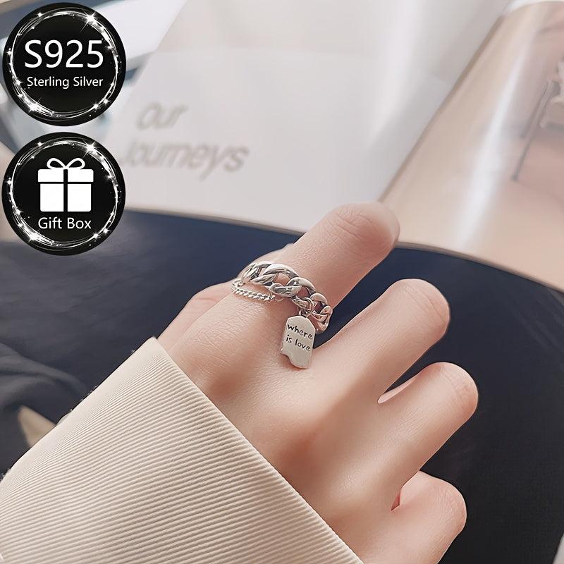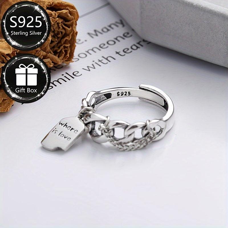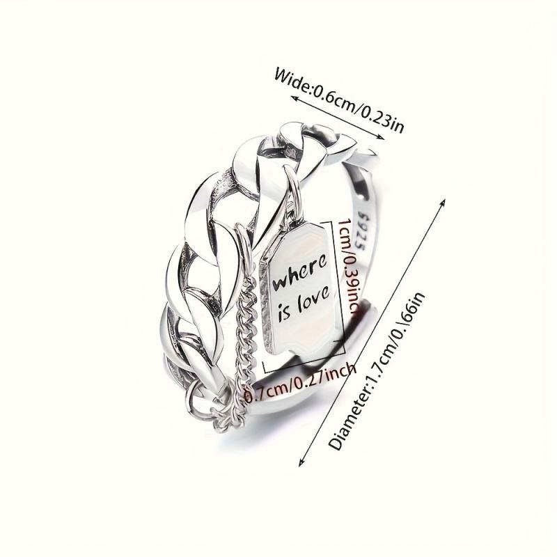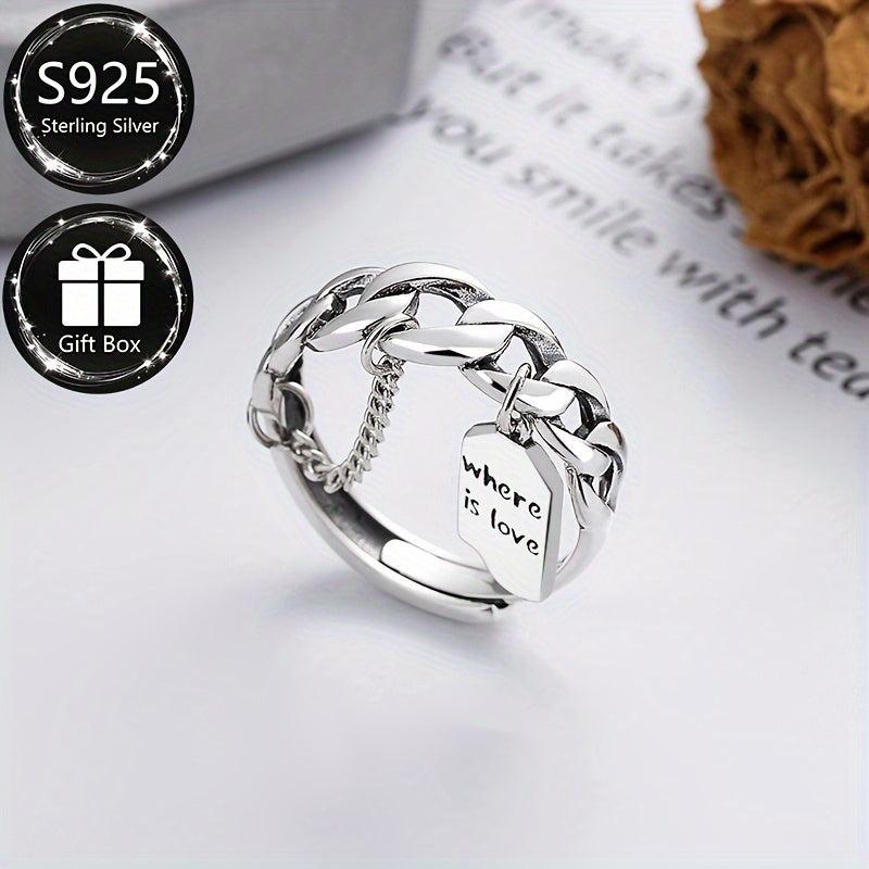 This vintage open ring features an engraved 'Where is Love' design crafted from 925 sterling silver. Suitable for daily wear and party outfits, making it a versatile accessory.